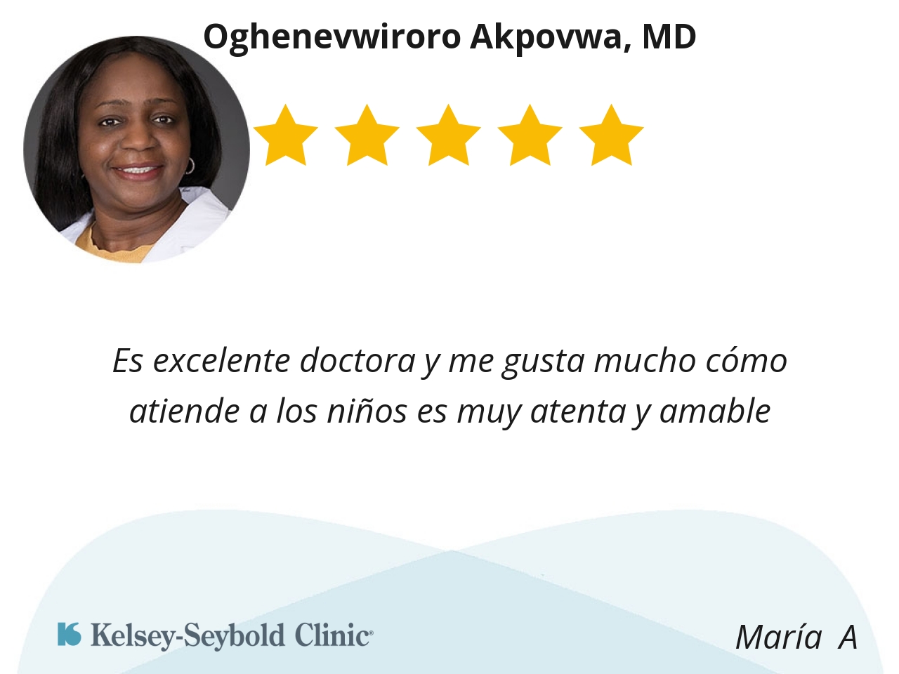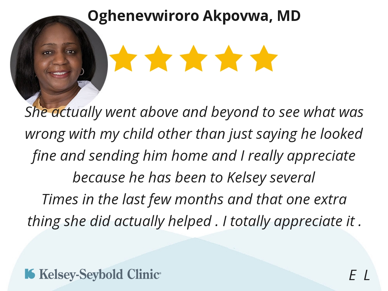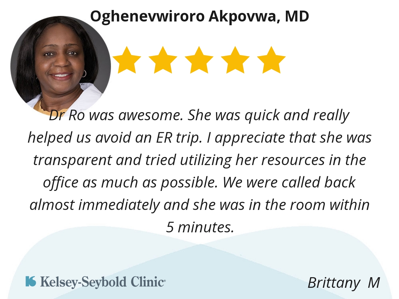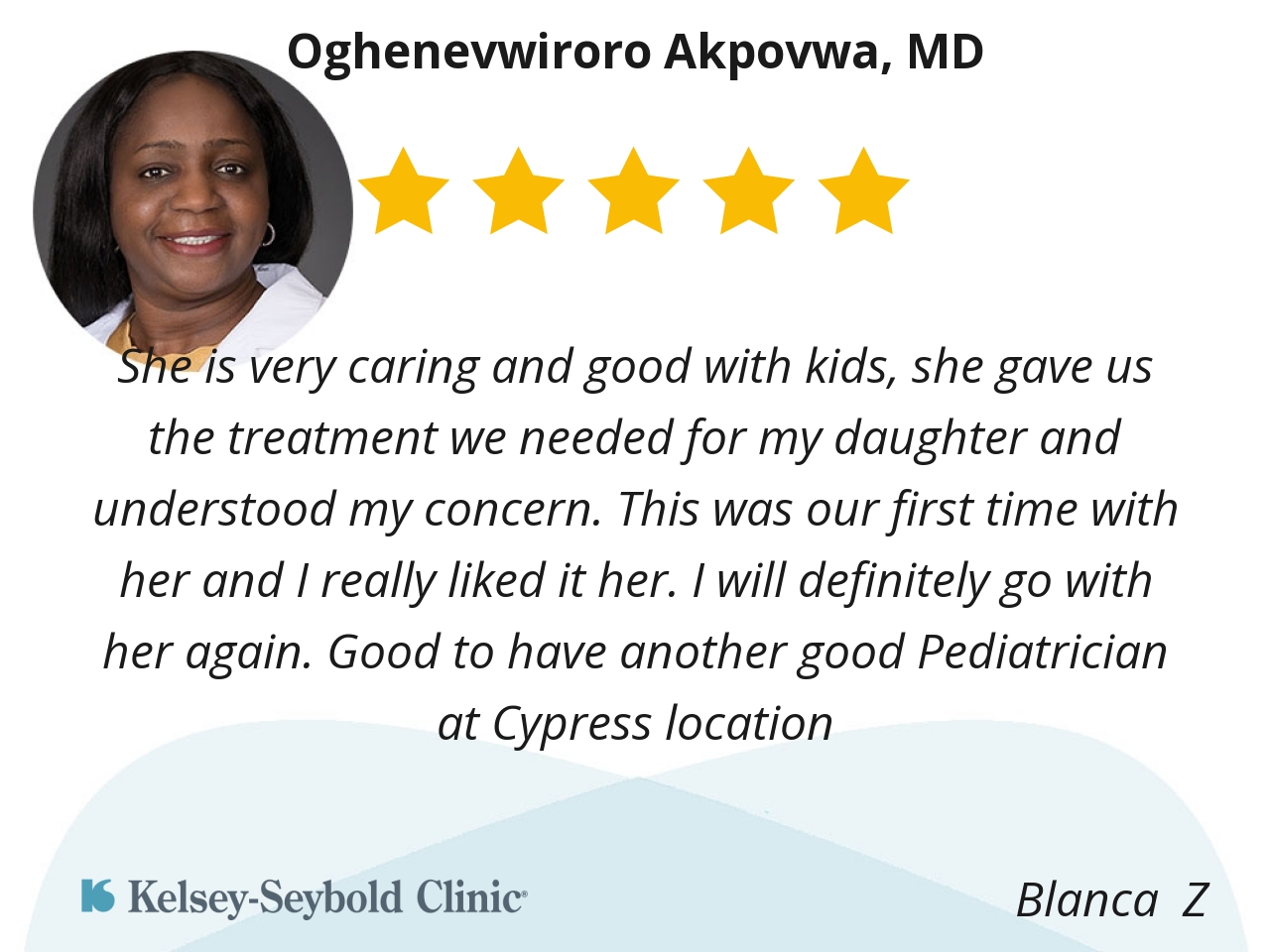Our pediatrician was unavailable and Dr. Akpovwa came thru for us in true, outstanding Kelsey-Seybold fashion. She was amazing and we’re very grateful for her.