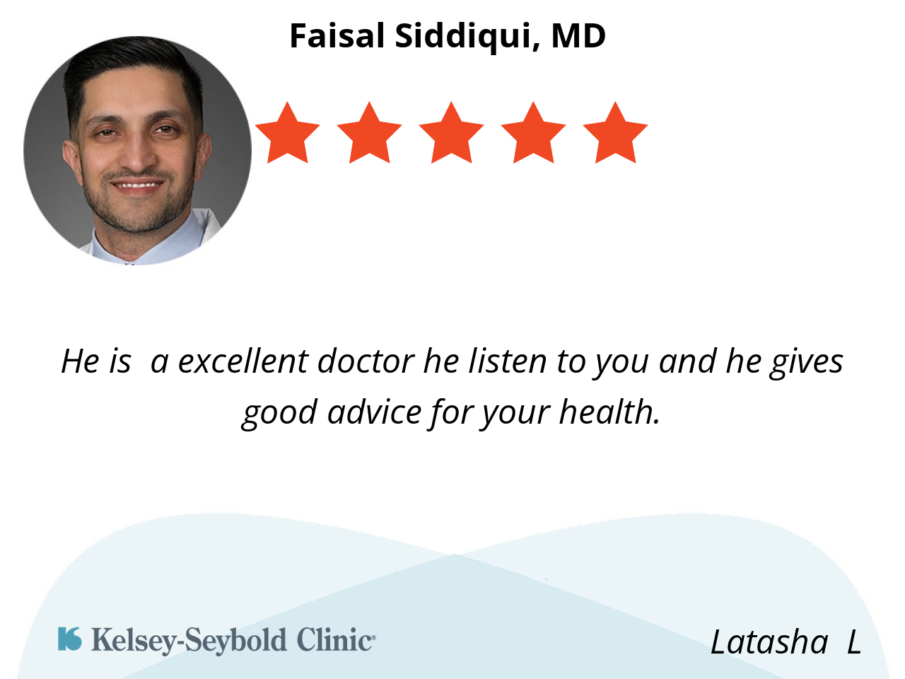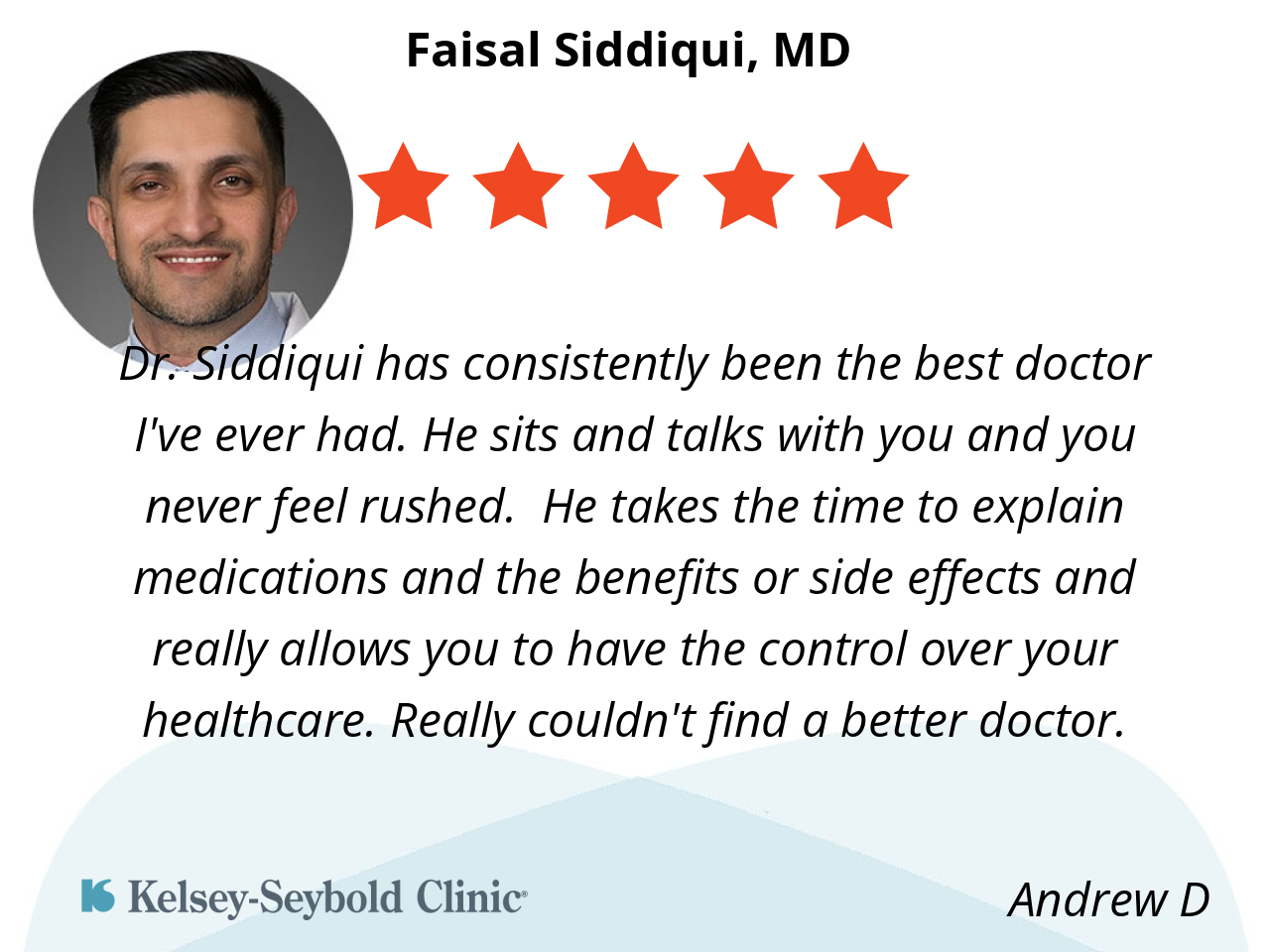 Dr. Siddiqui has consistently been the best doctor I've ever had. He sits and talks with you and you never feel rushed. He takes the time to explain medications and the benefits or side effects and really allows you to have the control over your healthcare. Really couldn't find a better doctor.