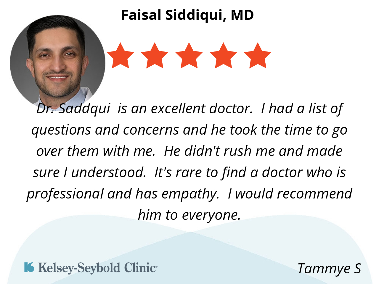 Dr. Siddiqi is very compassionate and knows the right questions to ask patients. You can tell that he’s genuinely interested in providing the right treatment plan for your specific medical needs.