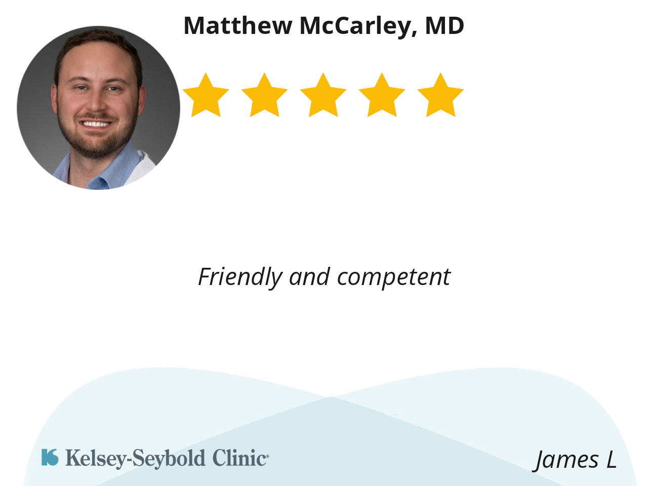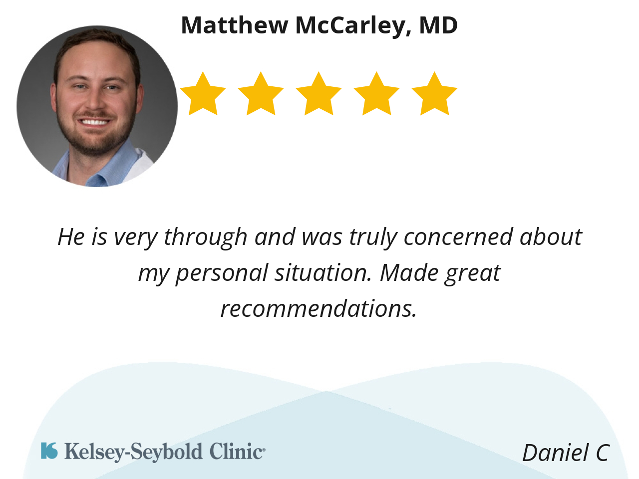 Dr. McCarley is an excellent Orthopedic surgeon! He is an attentive listener and is proactive in his approach to treatment options and does not automatically recommend surgery, when more testing or another method could be more appropriate. I appreciate that he reviews all xrays and MRI's directly with you and thoroughly explains the results, before discussing a treatment plan. As a complex patient medically, having a physician willing to collaborate with me regarding my care is a huge relief. I'm so happy I found him thru Kelsey Seybold.