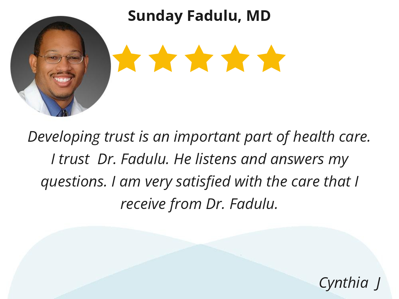 Developing trust is an important part of health care. I trust Dr. Fadulu. He listens and answers my questions. I am very satisfied with the care that I receive from Dr. Fadulu.