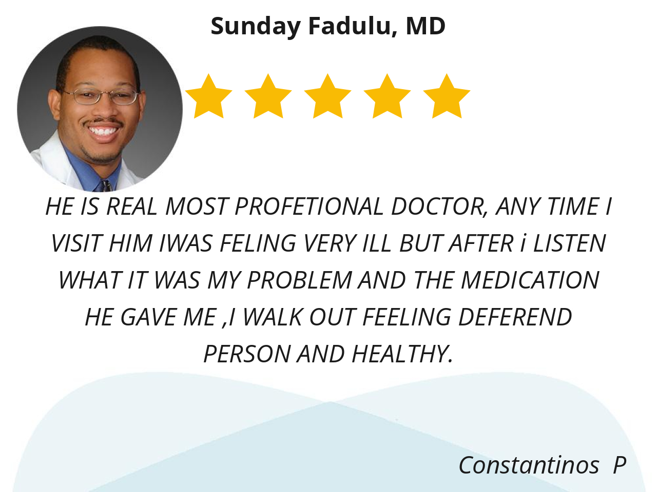 Dr. Fadulu is a great doctor. He exemplifies what a PCP doctor should be. He is very professional, he reviews my records when I come in, he asks me specific questions about my concerns for the visit and is able to answer them in a way I can understand. If he finds anything suspicious, he refers me to the appropriate specialist and does not try to guess what might be the problem. The most important thing about a PCP is if you can trust them. I trust him with my health. He even takes time to listens to me if there are any personal concerns going one in my life, which sometimes can affect physical health and offers specialist in that are a, if needed.