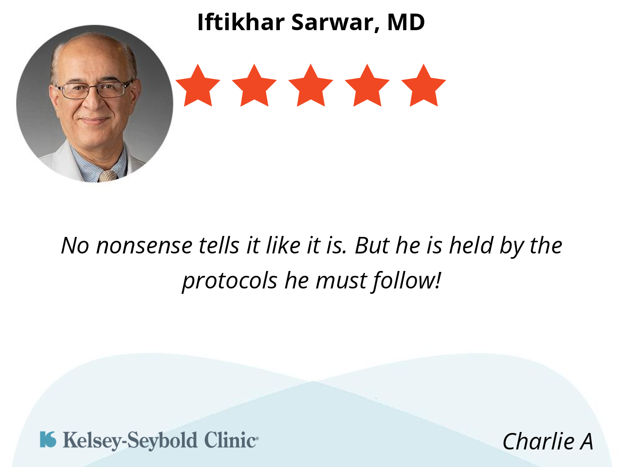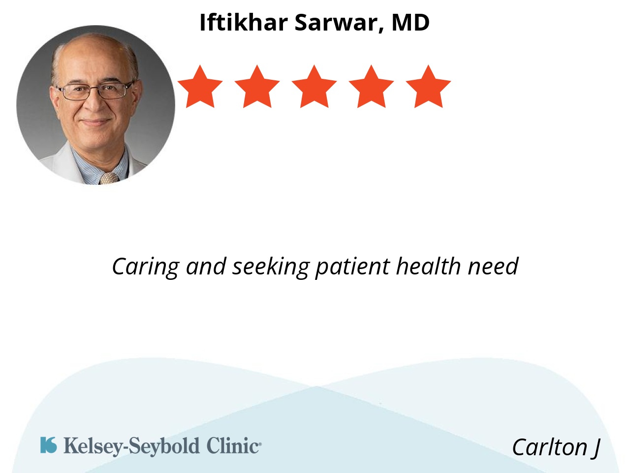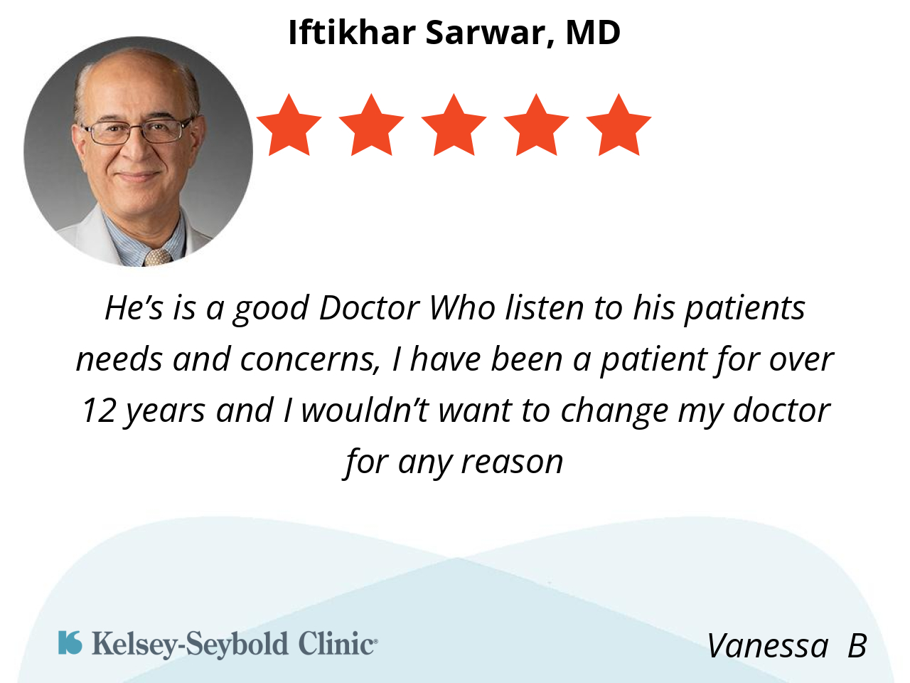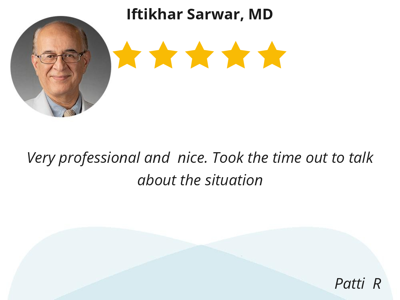 Dr. Sarwar has been my doctor for many years. He listens to my concerns and addresses them. He is honest, knowledgeable, and compassionate.