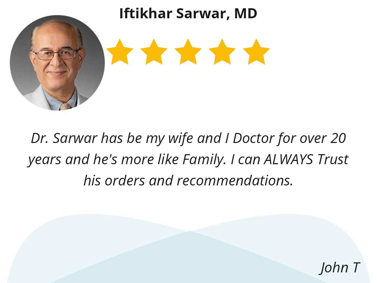 Dr. Sarwar has be my wife and I Doctor for over 20 years and he's more like Family. I can ALWAYS Trust his orders and recommendations.