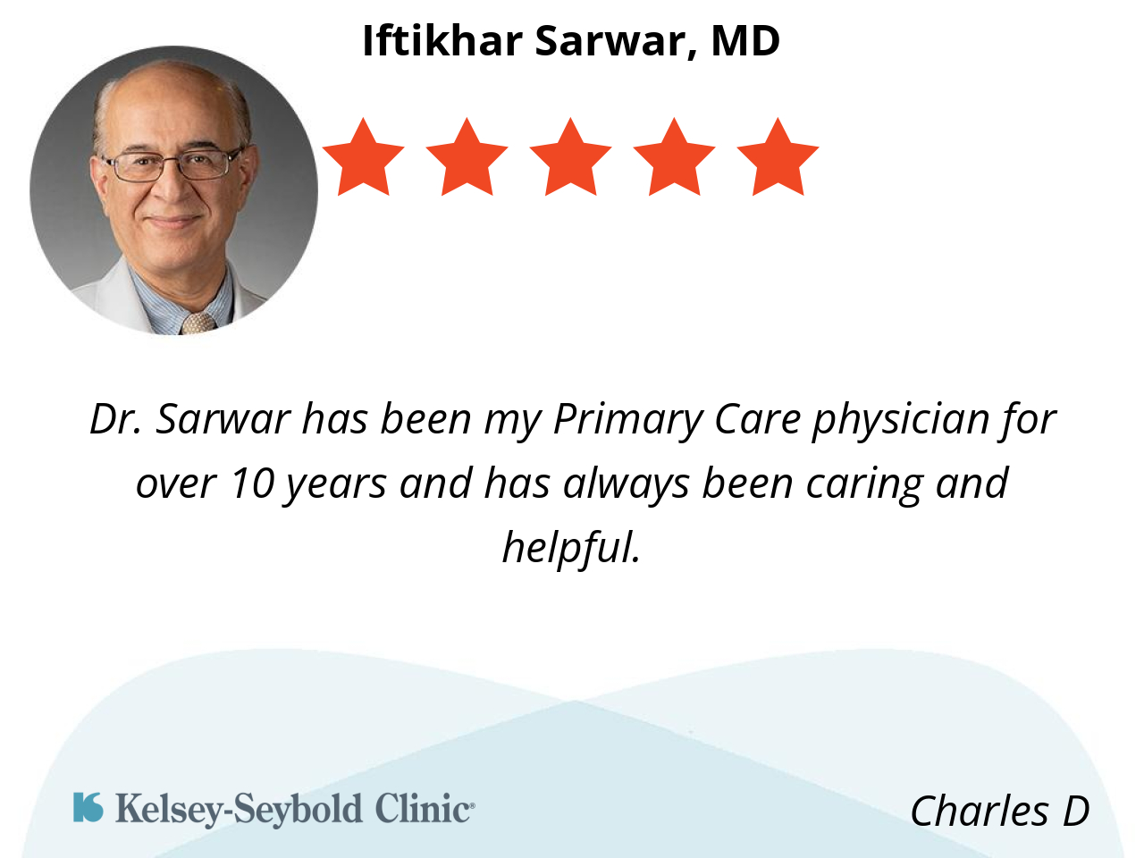 Dr. Sarwar has been my Primary Care physician for over 10 years and has always been caring and helpful.