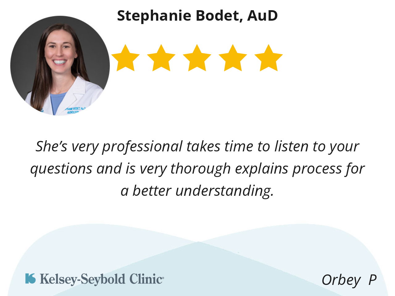 Dr. Bodet listens and conveys the answers to my questions to my understanding. More importantly she is friendly, courteous and patient.