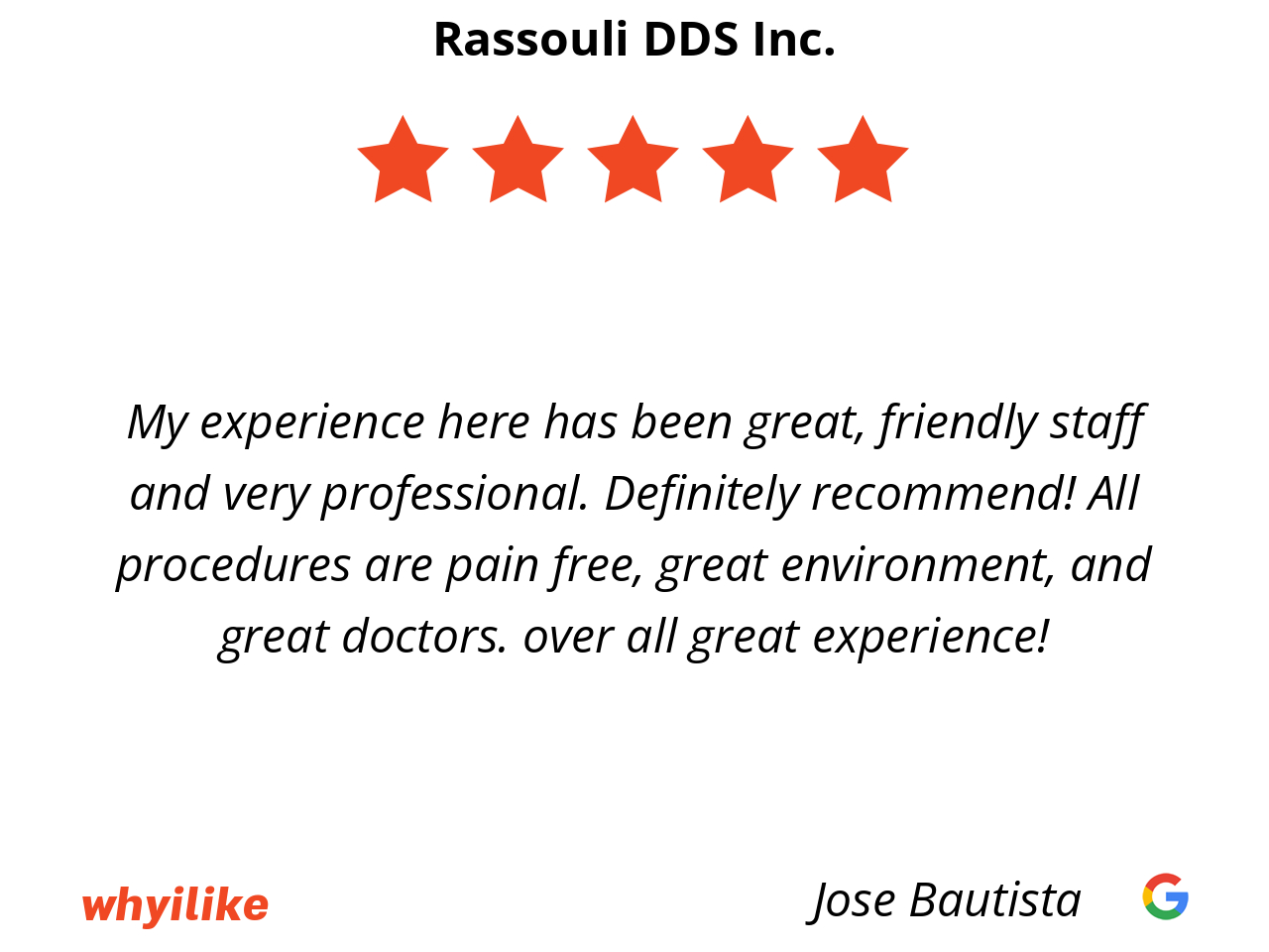 I love going to this office because they are very upfront with the things I need and don’t need. They use quality materials and their staff is SUPERB! Thanks Dr. Rassouli!