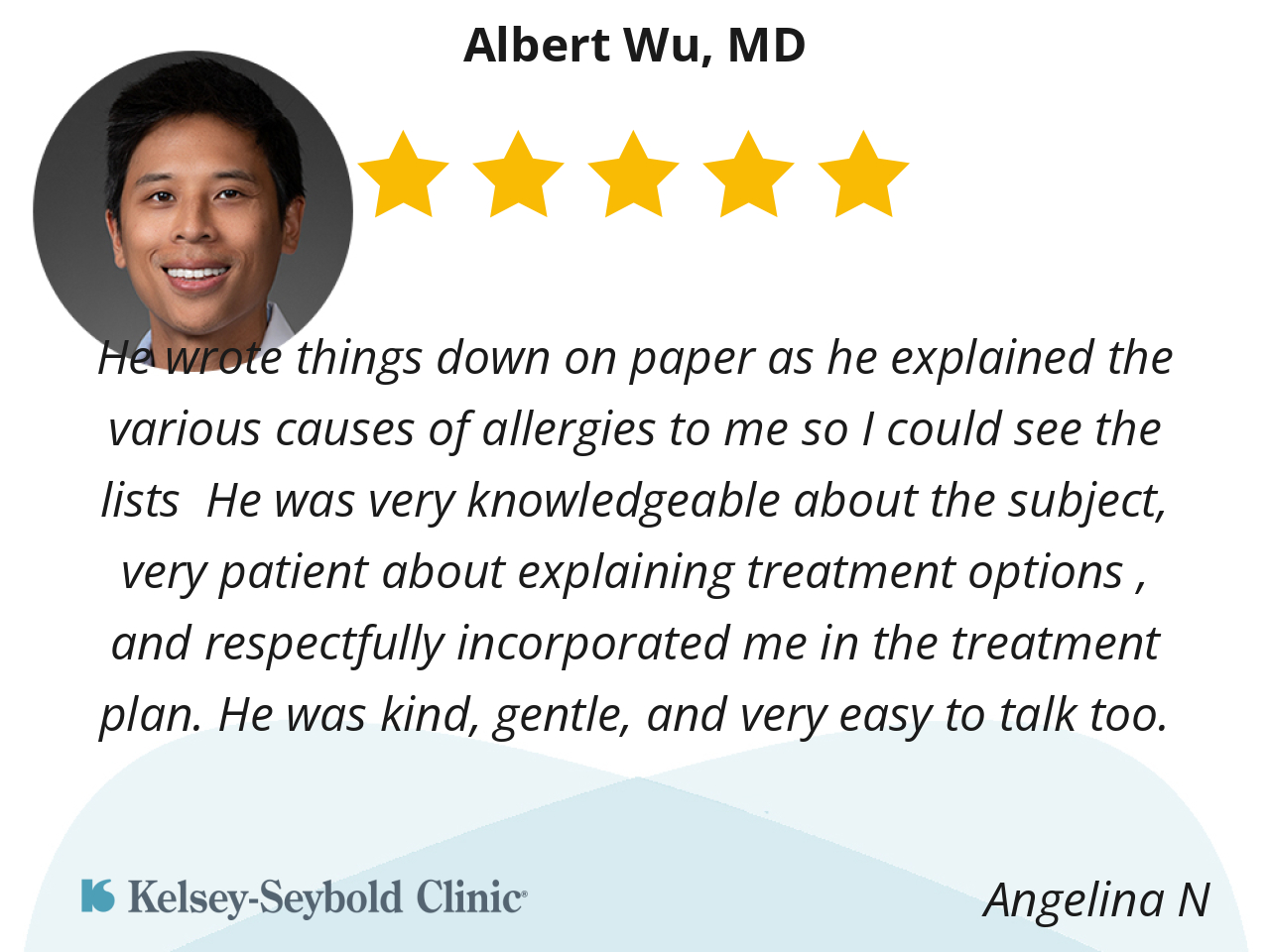 He wrote things down on paper as he explained the various causes of allergies to me so I could see the lists He was very knowledgeable about the subject, very patient about explaining treatment options , and respectfully incorporated me in the treatment plan. He was kind, gentle, and very easy to talk too.