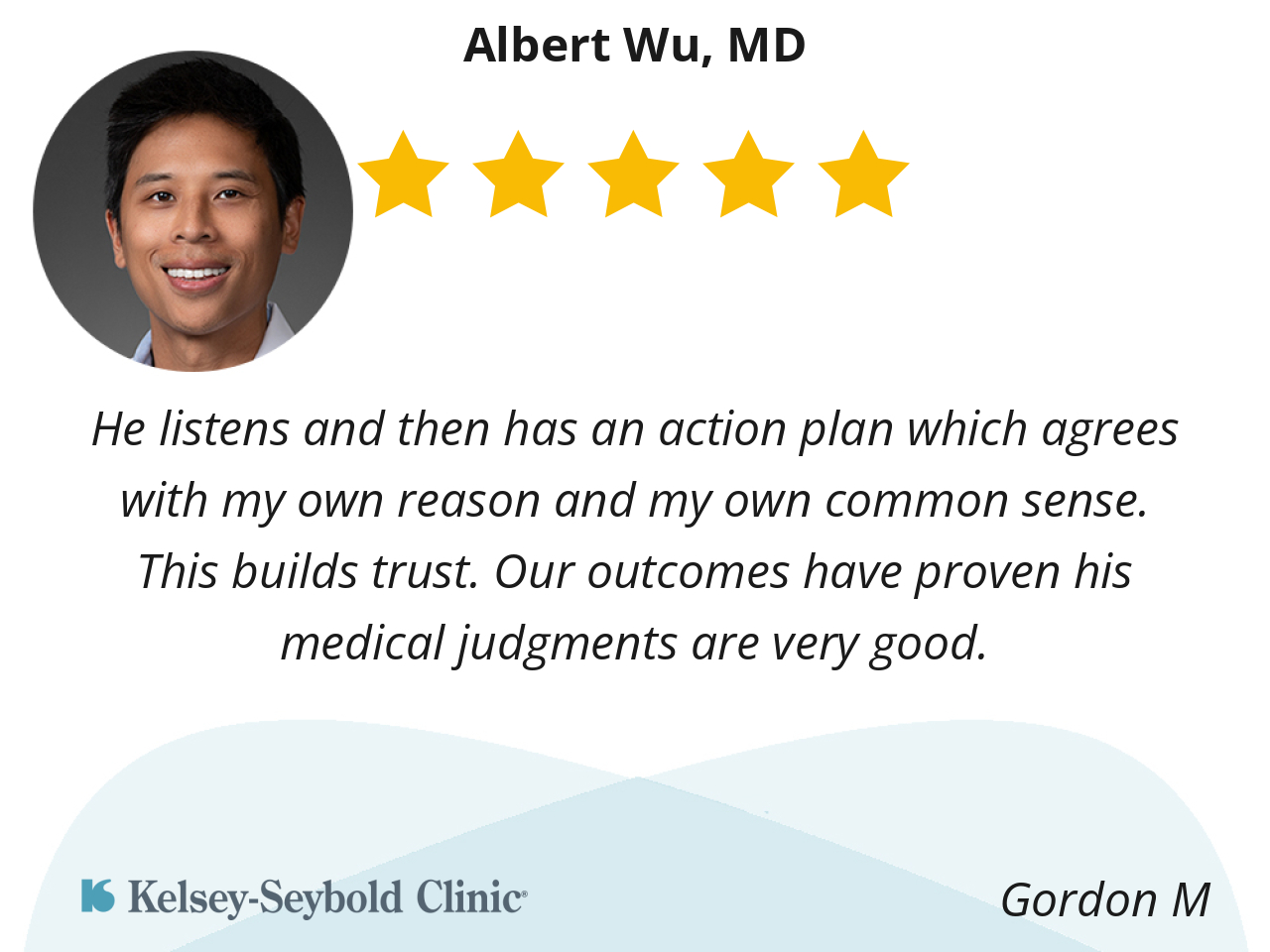 He listens and then has an action plan which agrees with my own reason and my own common sense. This builds trust. Our outcomes have proven his medical judgments are very good.