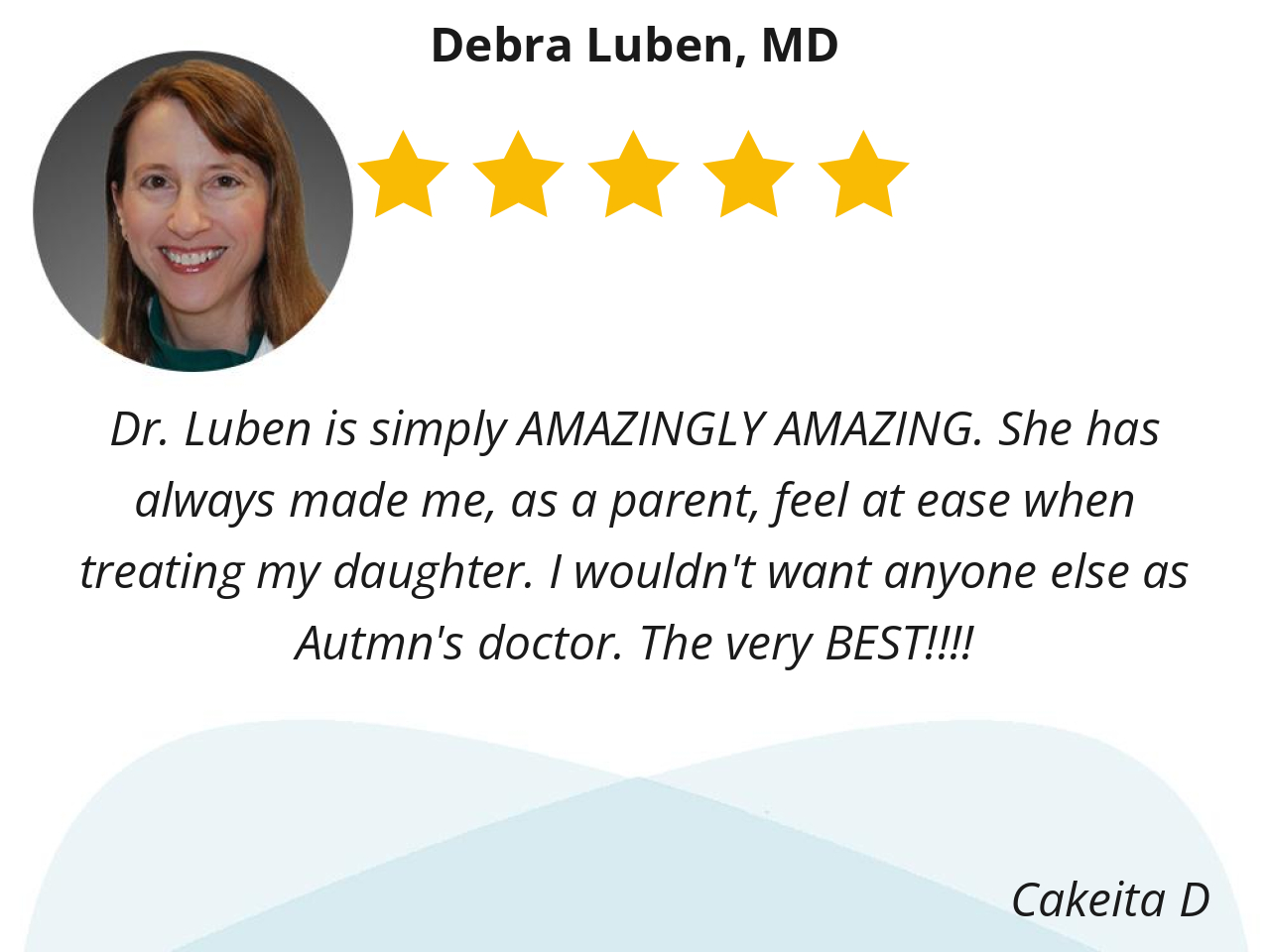 We have been seeing Dr. Luben since our 12 year old was an infant. She has gotten to know our children, always takes the time to listen to our concerns, and provides a careful assessment.