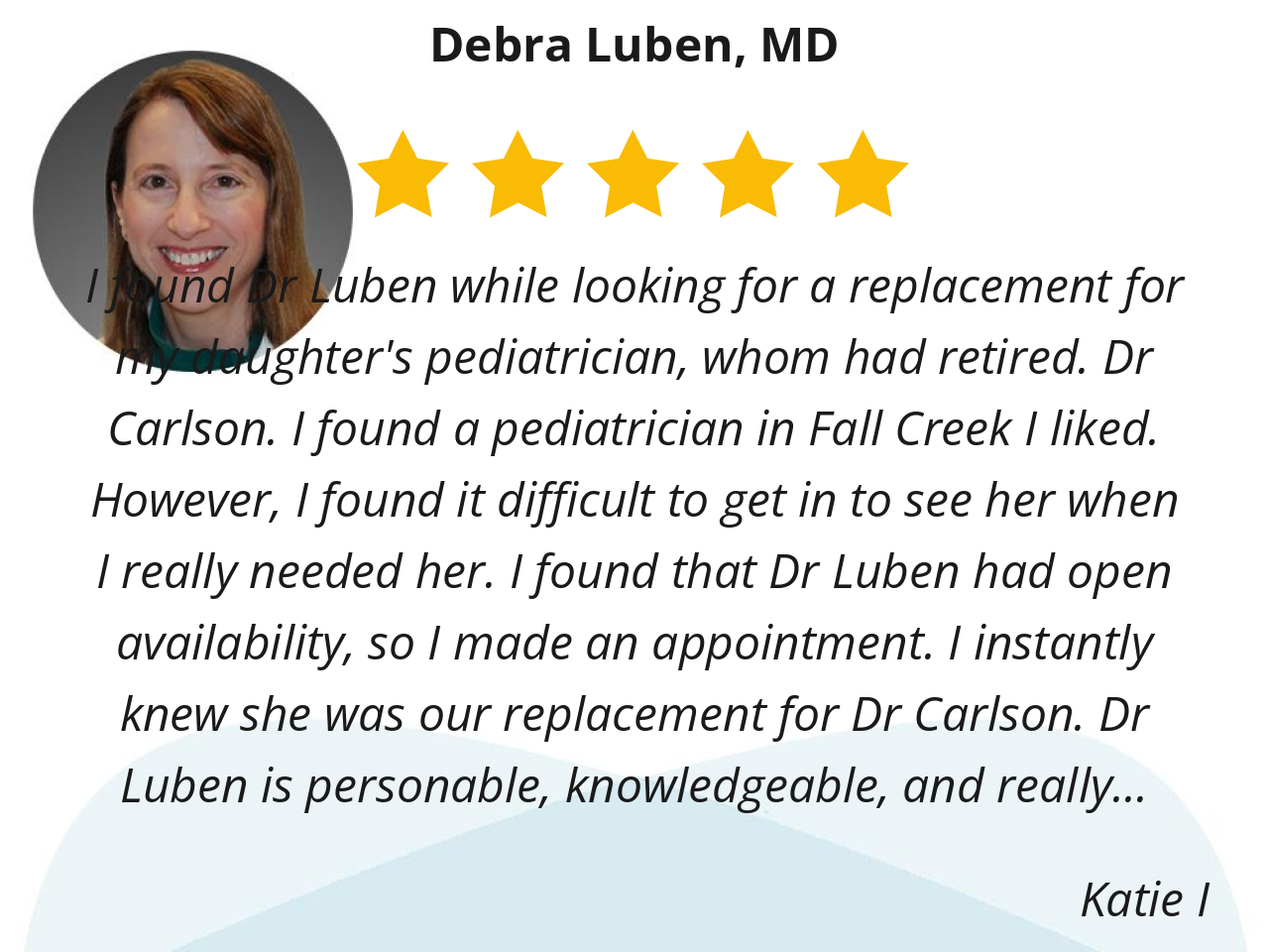 I found Dr Luben while looking for a replacement for my daughter's pediatrician, whom had retired. Dr Carlson. I found a pediatrician in Fall Creek I liked. However, I found it difficult to get in to see her when I really needed her. I found that Dr Luben had open availability, so I made an appointment. I instantly knew she was our replacement for Dr Carlson. Dr Luben is personable, knowledgeable, and really takes her time to listen to my concerns or just general questions. I love that she's always available if my daughter is suddenly sick. I would say one of her best qualities is that she takes the time to listen. We have been seeing Dr Luben for well over a year now, and will continue to do so!