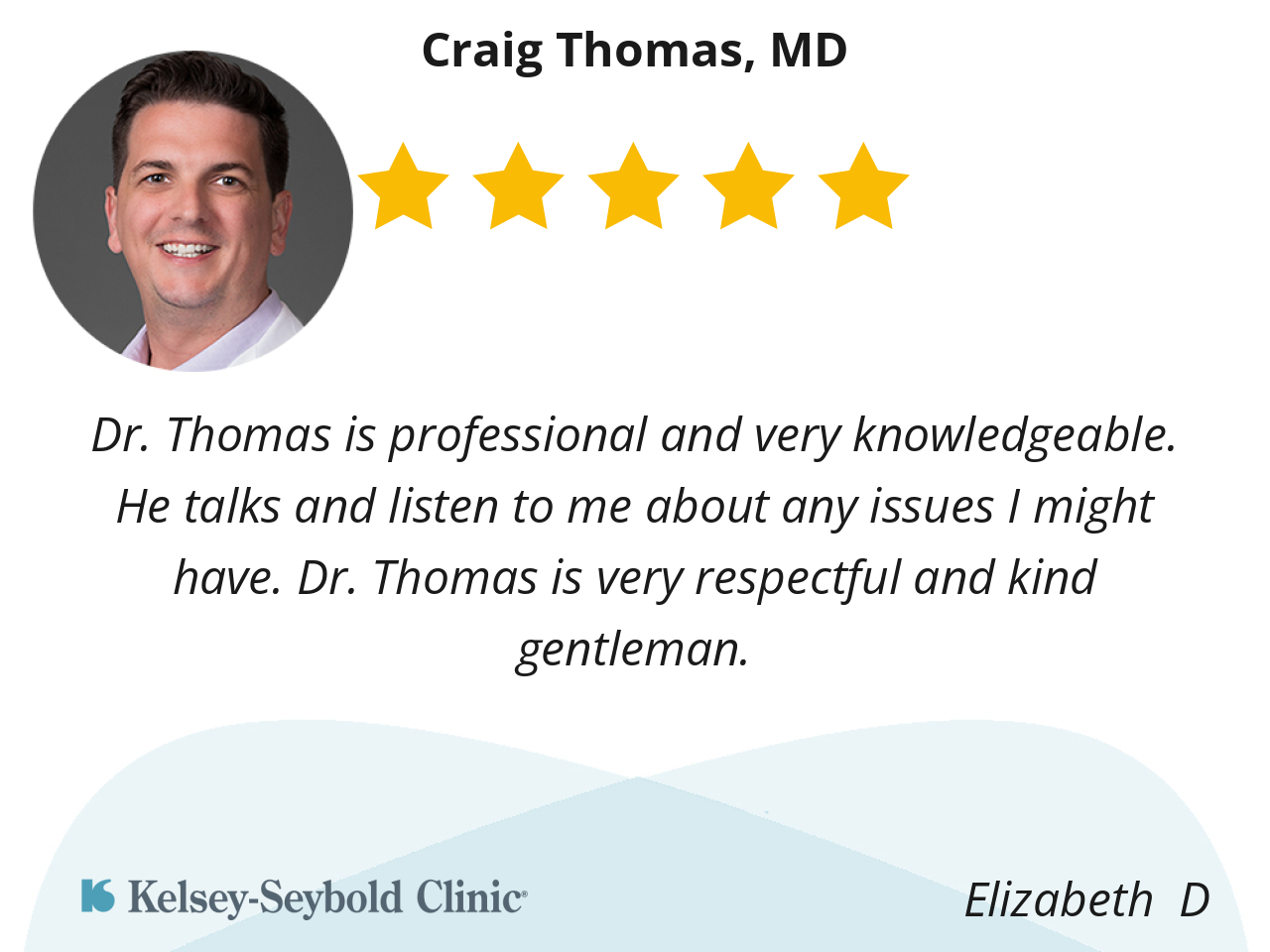 All doctor at kelsey Seybold are wonderful ..I hated to leave the North Campus ..But the clinic Dr Craig Thomas M.D. work at is more convenient for me ..it is very close to my home .Dr Steven Thomas he is very thorough and all way help me..Dr Craig Thomas is very nice he listens to me well and tell me what is going on with me..and is very kind .