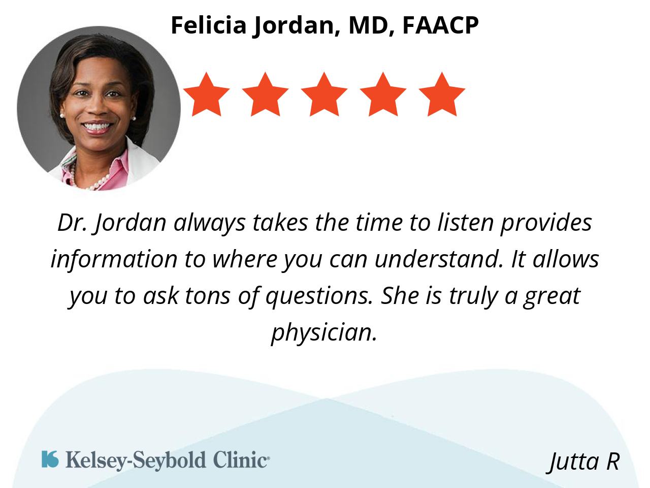Dr. Jordan is kind and she listens to my concerns. She is the first doctor that I have found that hears me and I feel that she has my best interest and cares what I feel and think. She makes me feel comfortable.