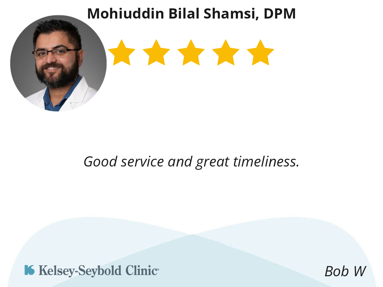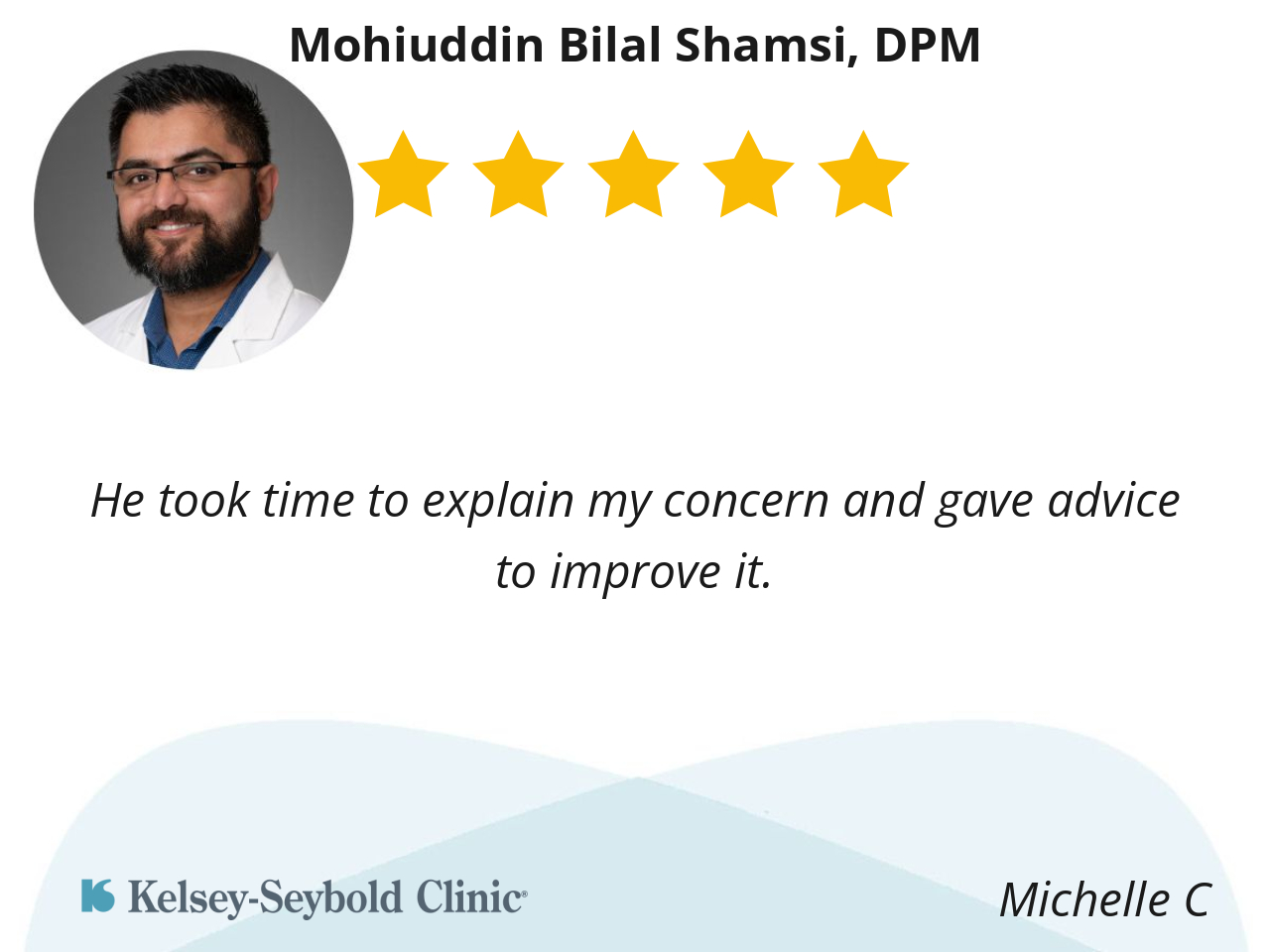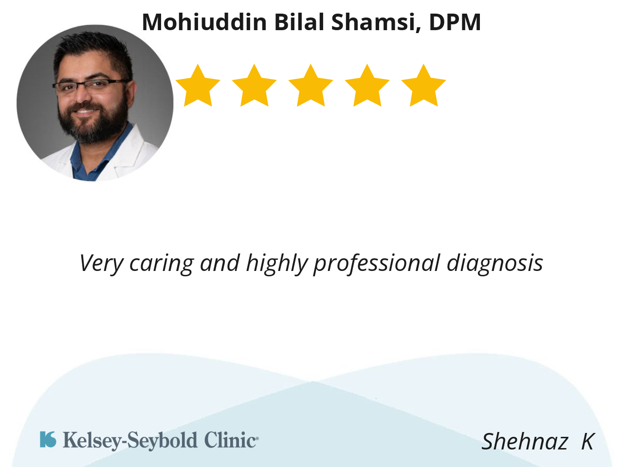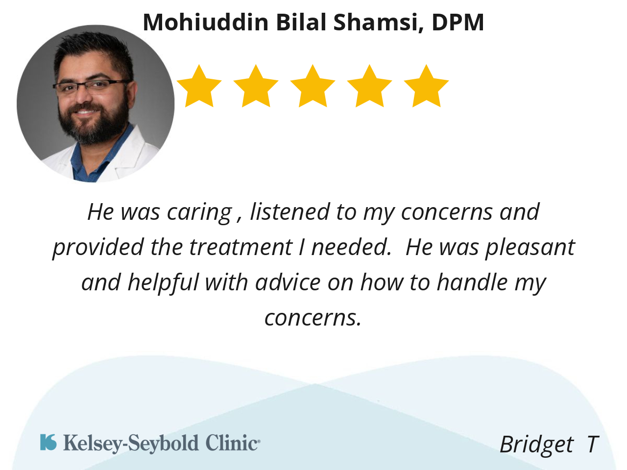 I’m very pleased with Dr. Shamsi. His professionalism and attention to detail I found very satisfying. I would recommend him to other patients if in need of foot issues.