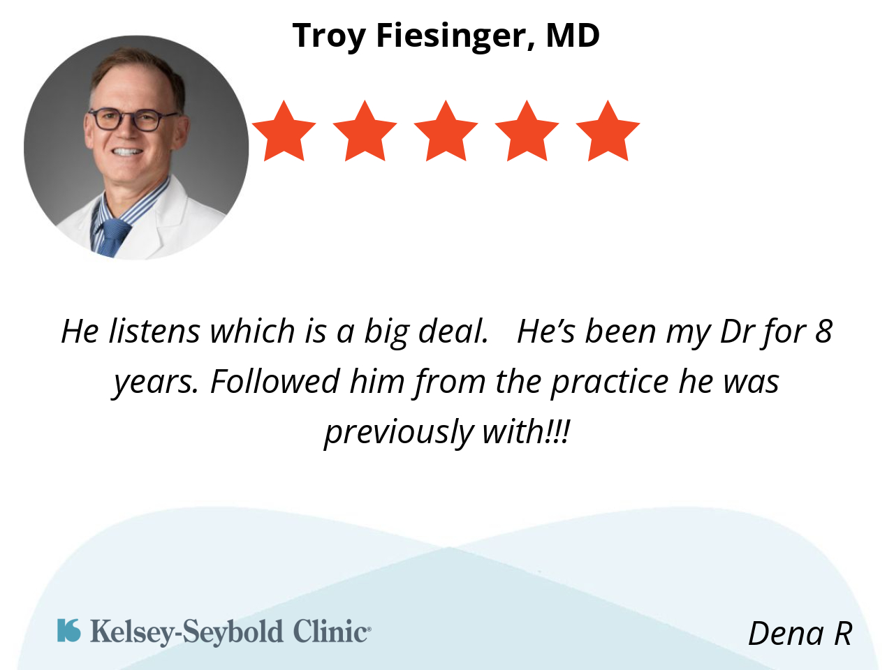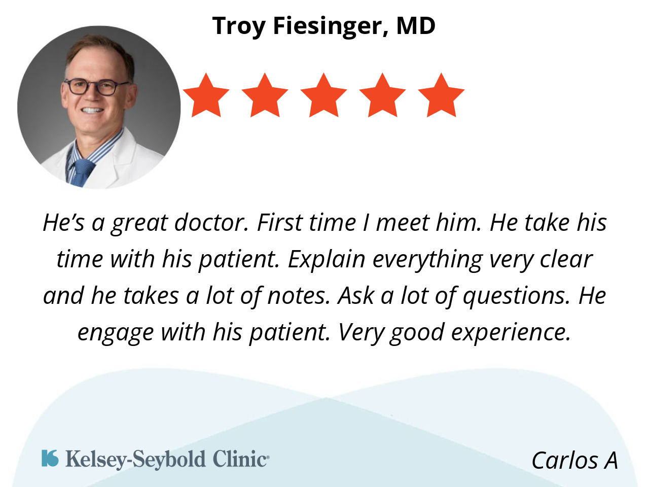 This was my first visit with Dr. Fiesinger. I had such a great experience. He was very attentive addressing all my concerns. He took his time and I didn’t feel rushed. I look for as to seeing him again.