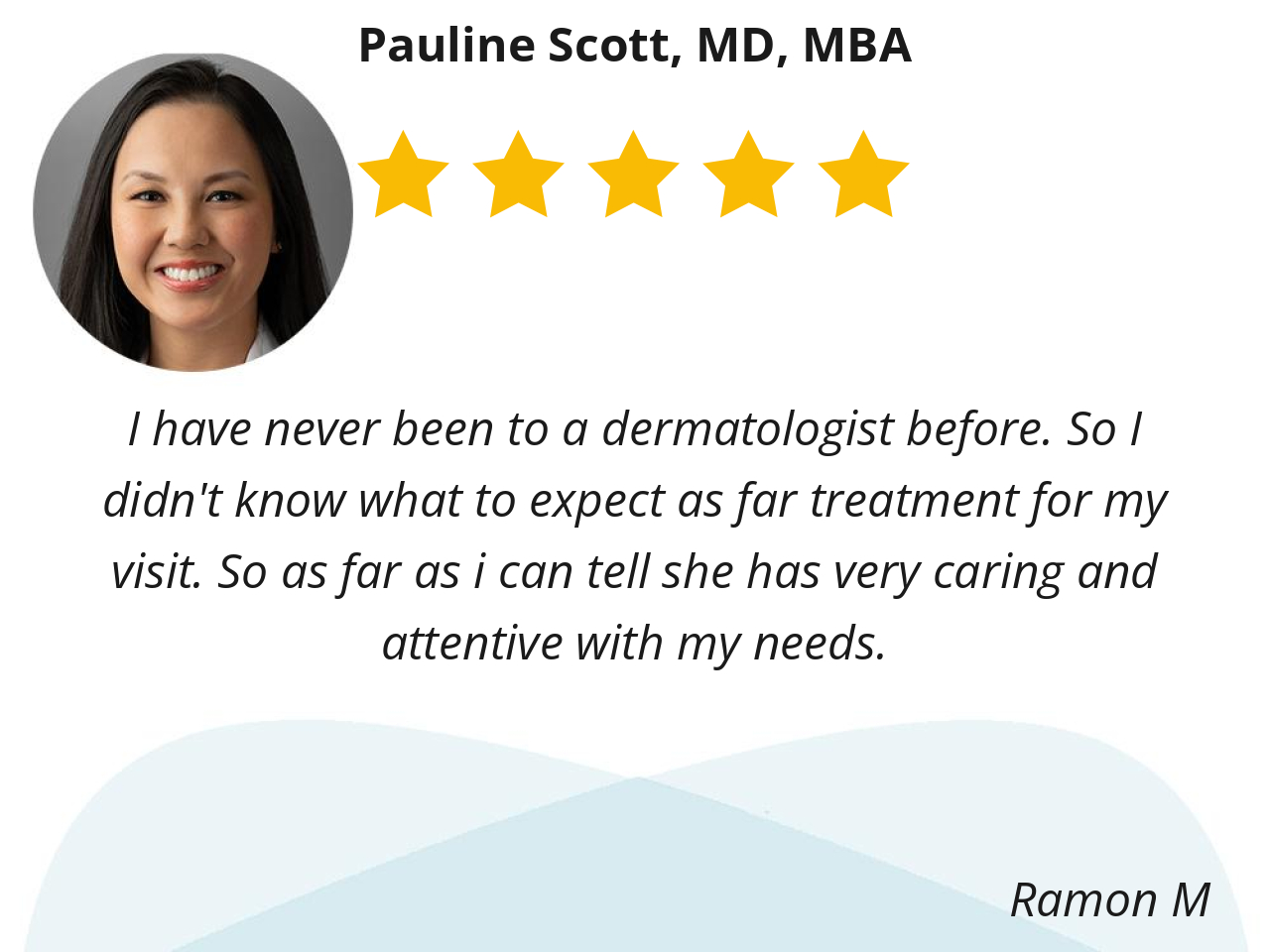 I have never been to a dermatologist before. So I didn't know what to expect as far treatment for my visit. So as far as i can tell she has very caring and attentive with my needs.