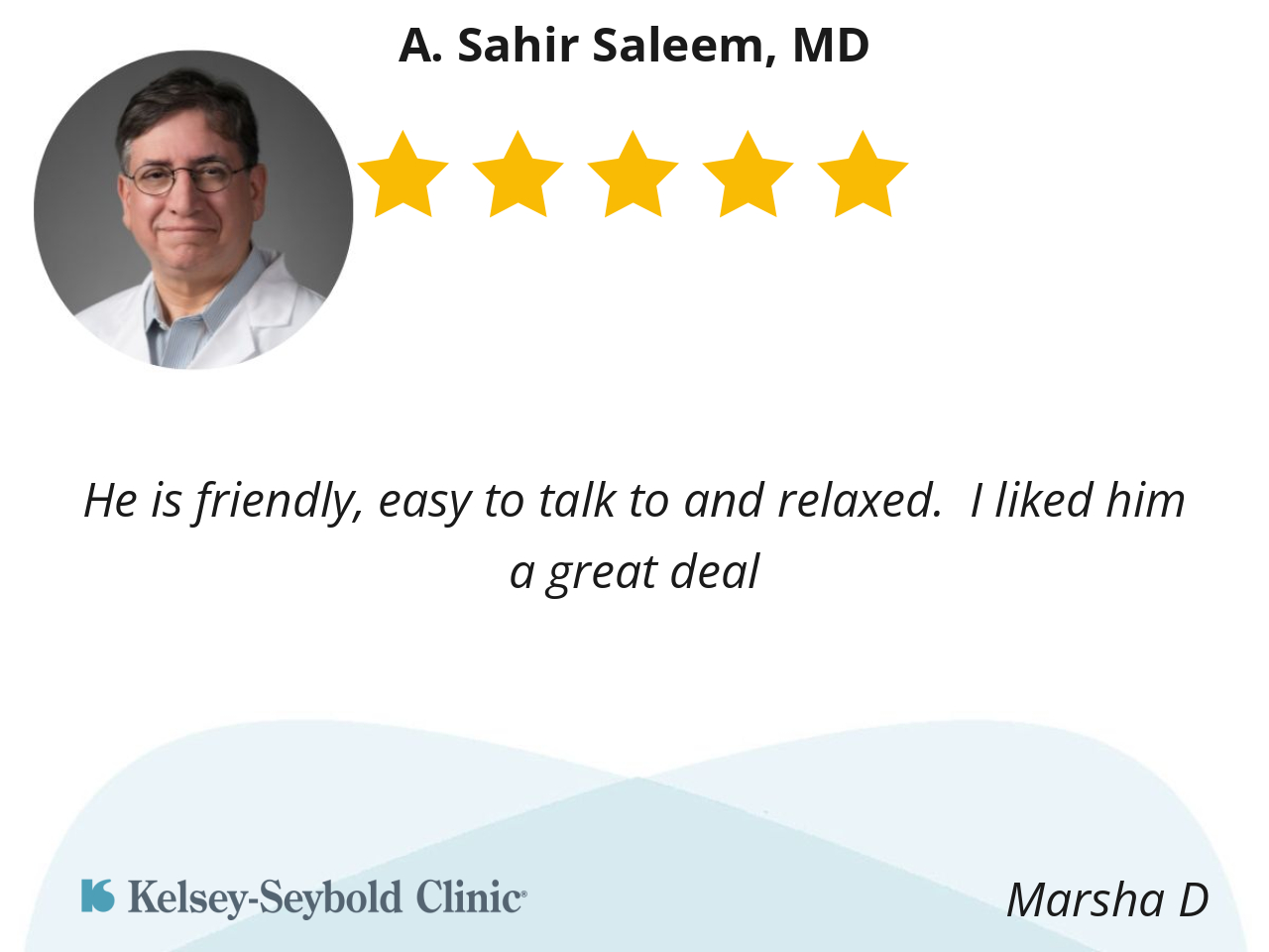 Dr. Saleem is extremly kind, patient, and knowledgeable. In my opinion, he is easy to talk to and wants to work with you to achieve the best outcome.