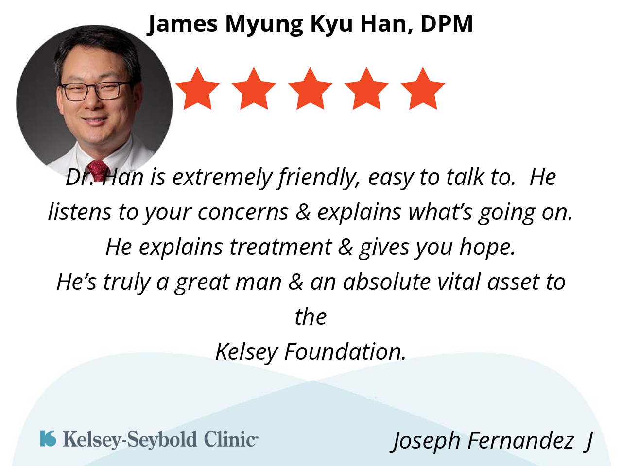 He’s easy to talk to and he listens. Also, he asked question to see how you’re doing and he cares about his patience. Doctor Han will it take your time to look at your situation and make sure he’s giving you good care. I was reading him from under 10 I will give him a 10.