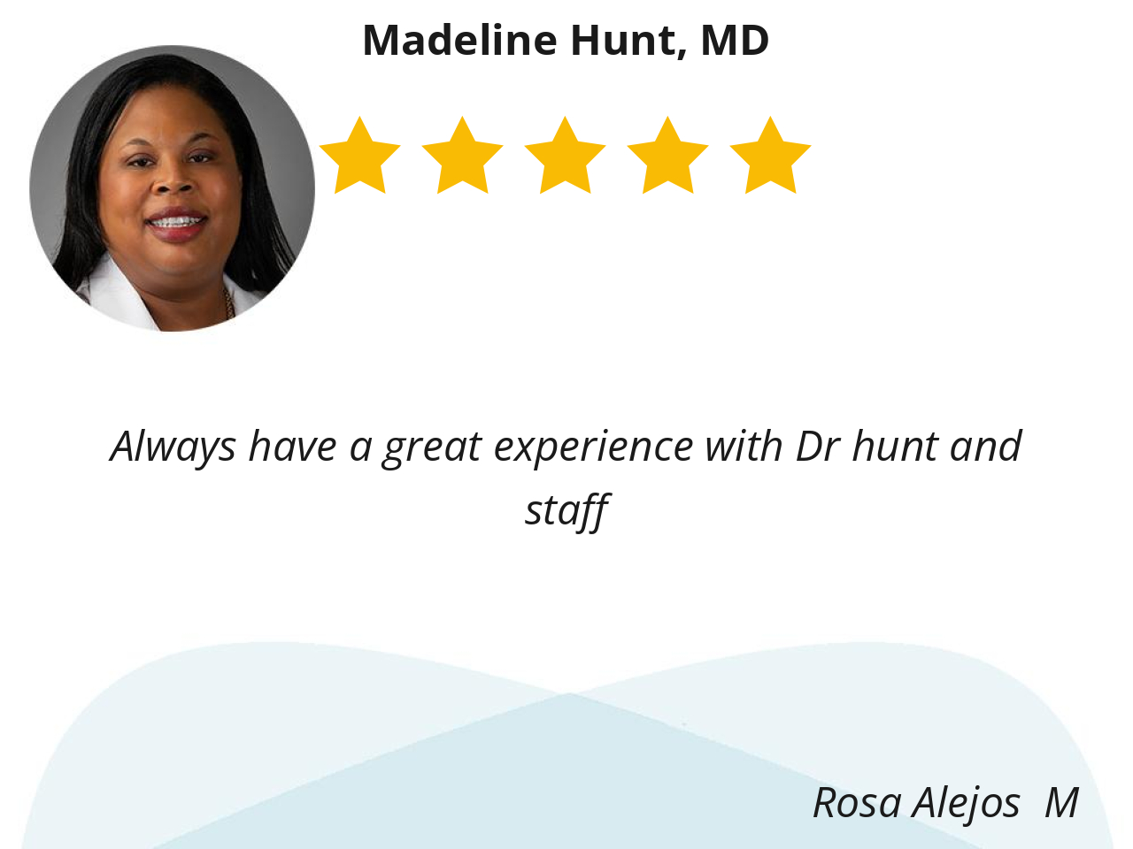 Dr Hunt really sweet and concerned Dr. I would recommend my friends and family to her.