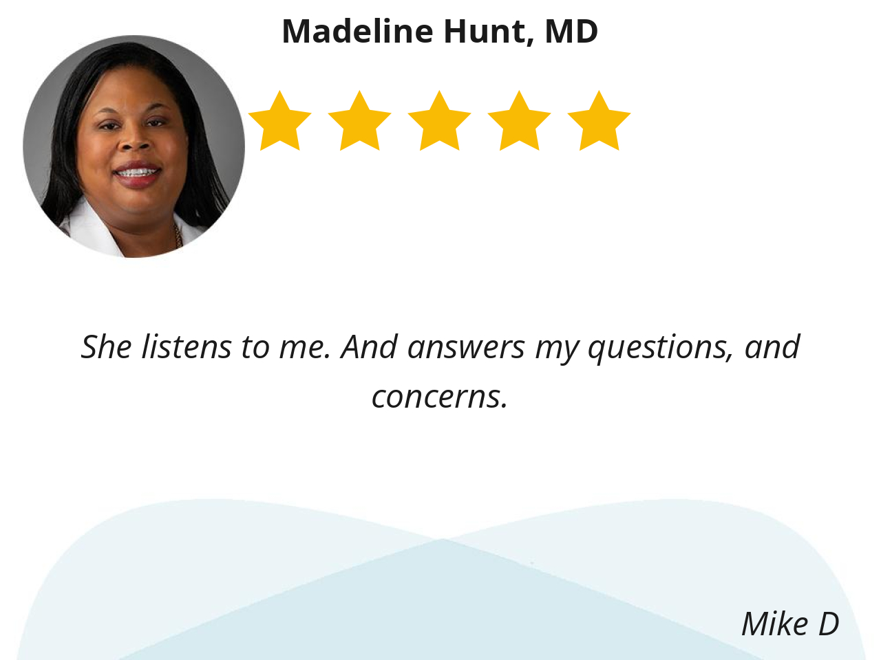 Dr Hunt is always listens to what I have to say. She is pleasant and efficient and puts me at ease with whatever my problem happens to be. It’s so nice to be able to talk to your doctor and know that you matter. Certainly would recommend her.