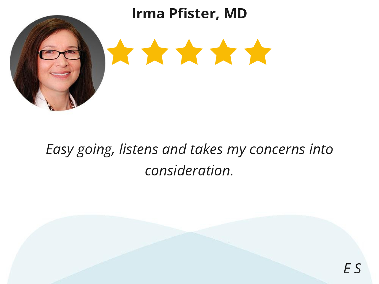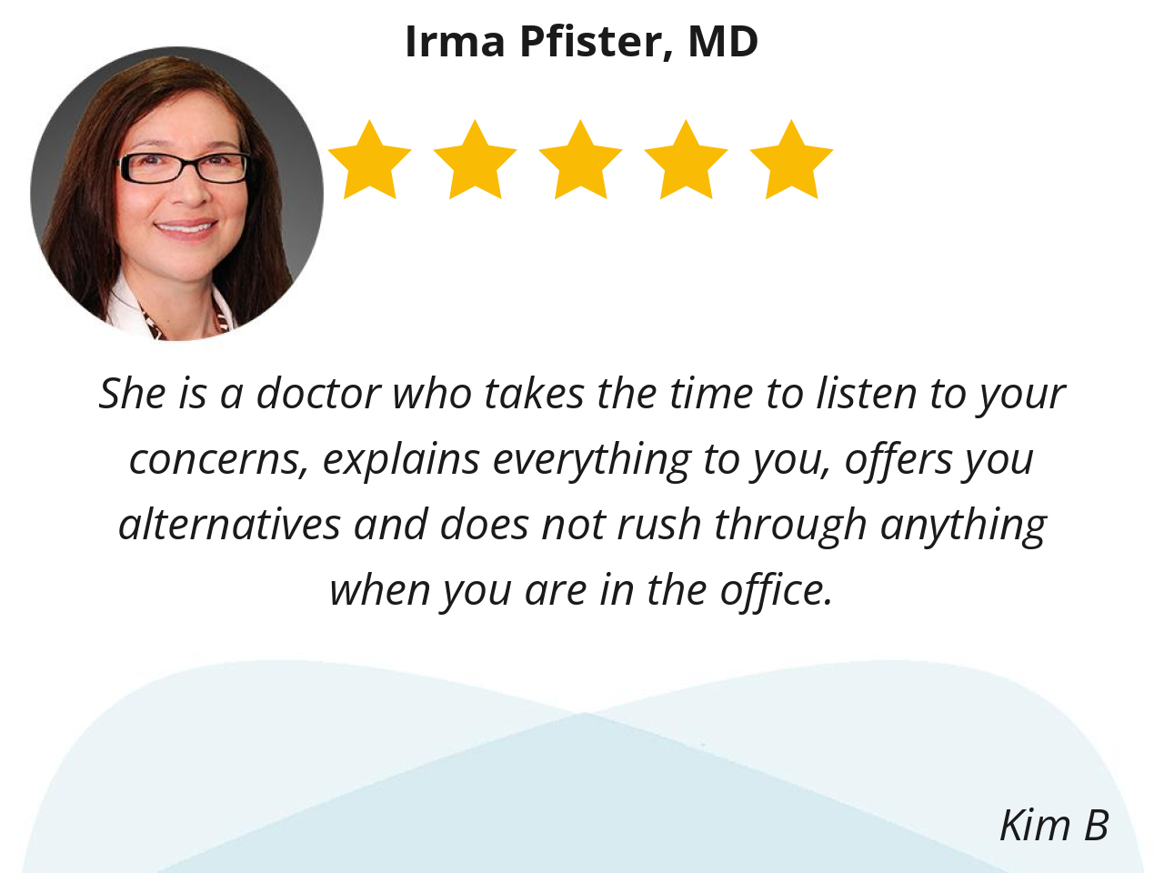 Dr Pfister has the best bedside manner. She is always so engaged and supportive in your health concerns and questions. I only see her once a year for a check up. Thanks to her keeping me well. Every time I see her and her nurse it’s like seeing old friends. She is just the best!