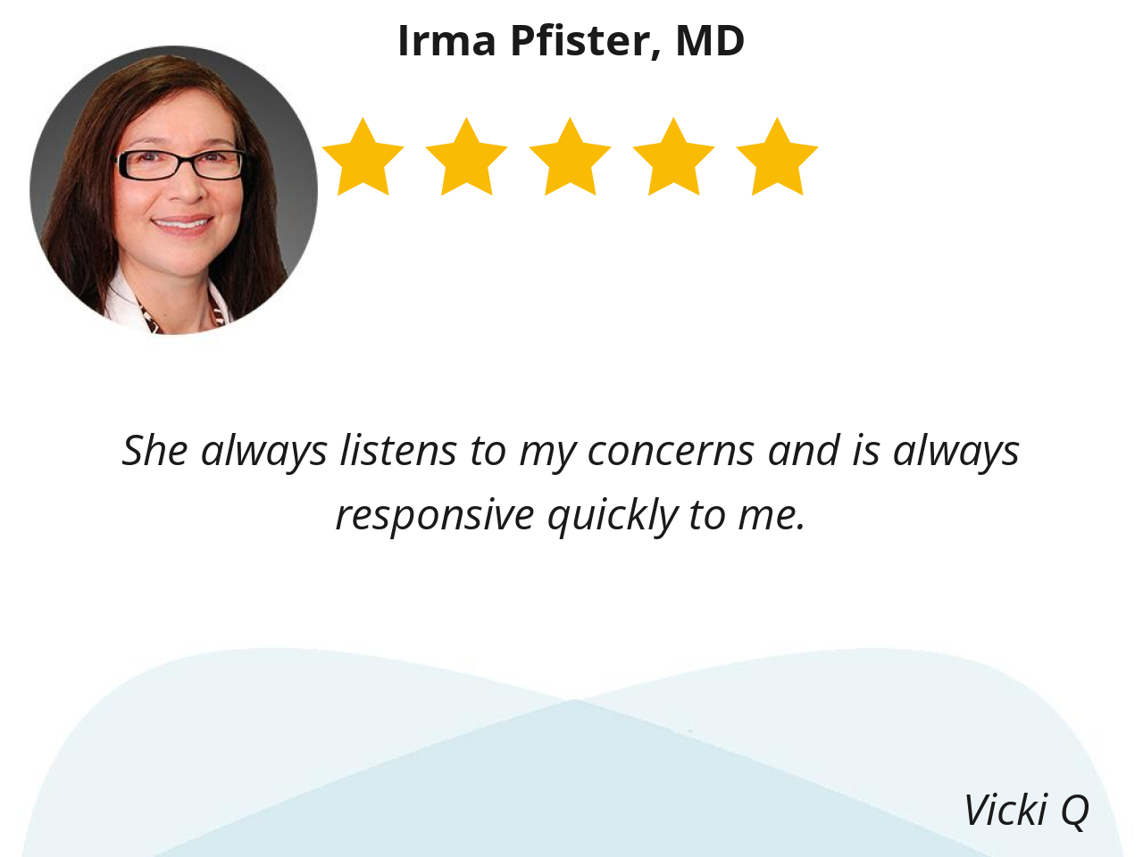 I love Dr. Pfister in lot of ways. She is available always , when I need her, quick response for questions. Listens, act according to that. Very