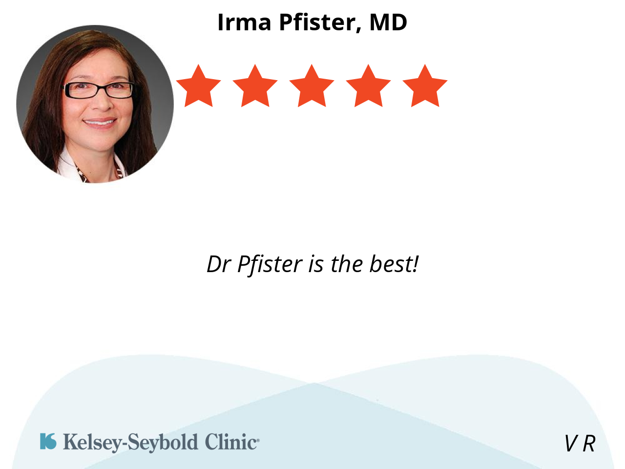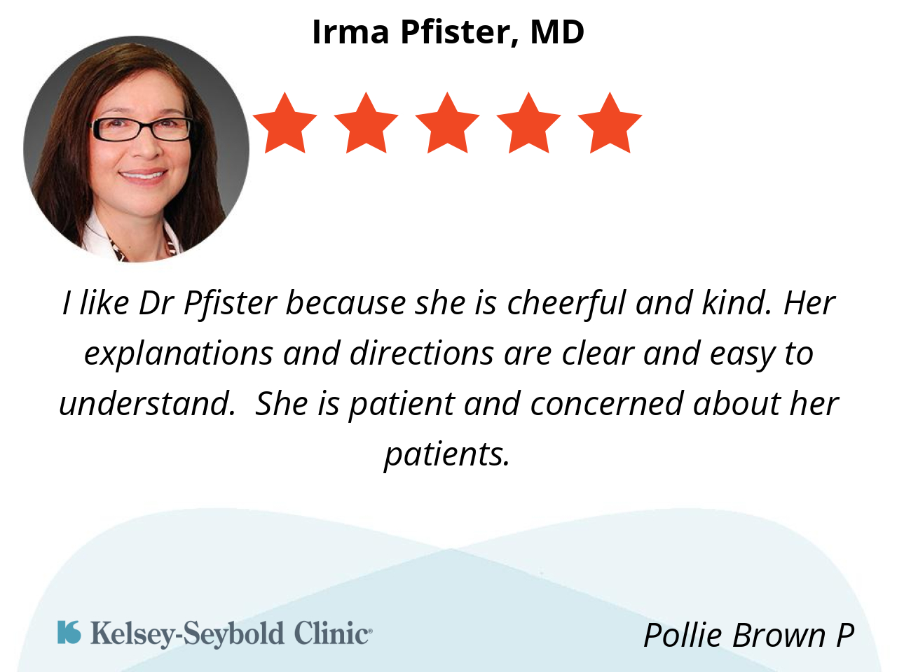 I like Dr Pfister because she is cheerful and kind. Her explanations and directions are clear and easy to understand. She is patient and concerned about her patients.