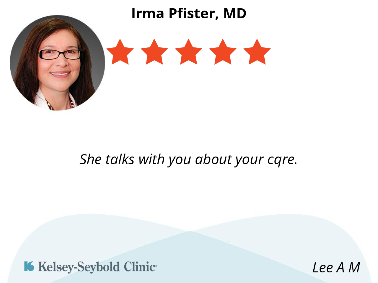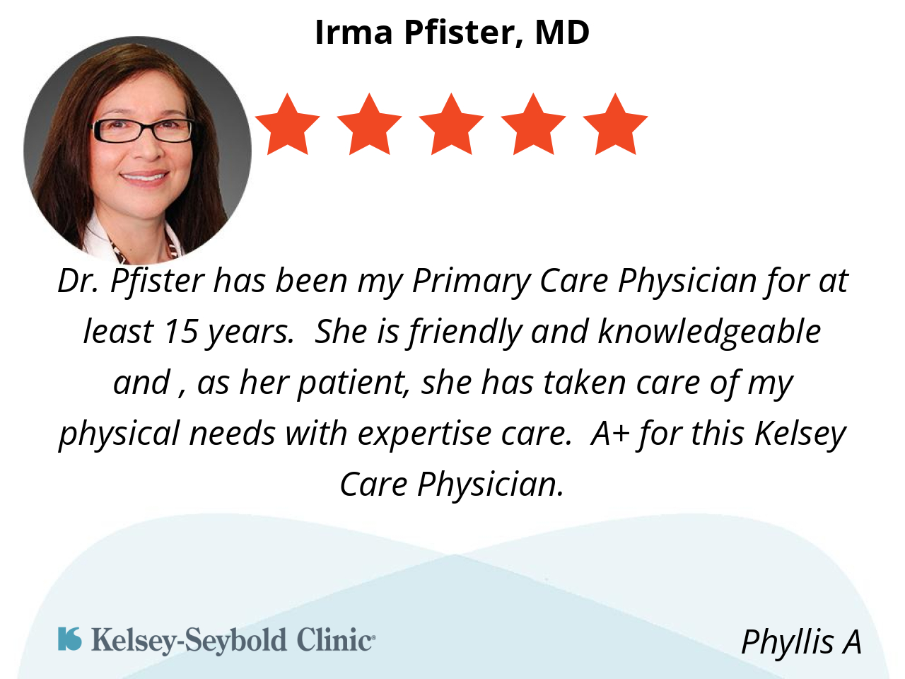 Dr. Pfister has been my Primary Care Physician for at least 15 years. She is friendly and knowledgeable and , as her patient, she has taken care of my physical needs with expertise care. A+ for this Kelsey Care Physician.