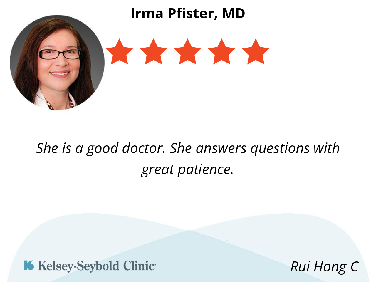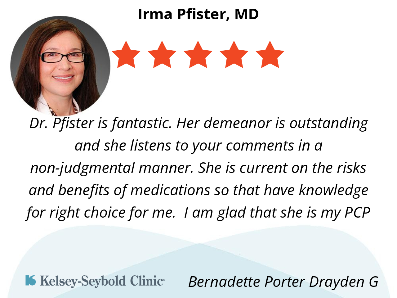 I like Dr. Pfister because she is diabetes knowledgeable. She listens to my health concerns and presents options for me to consider. She is professional, kind, and personable. I always feel at ease in her presence.