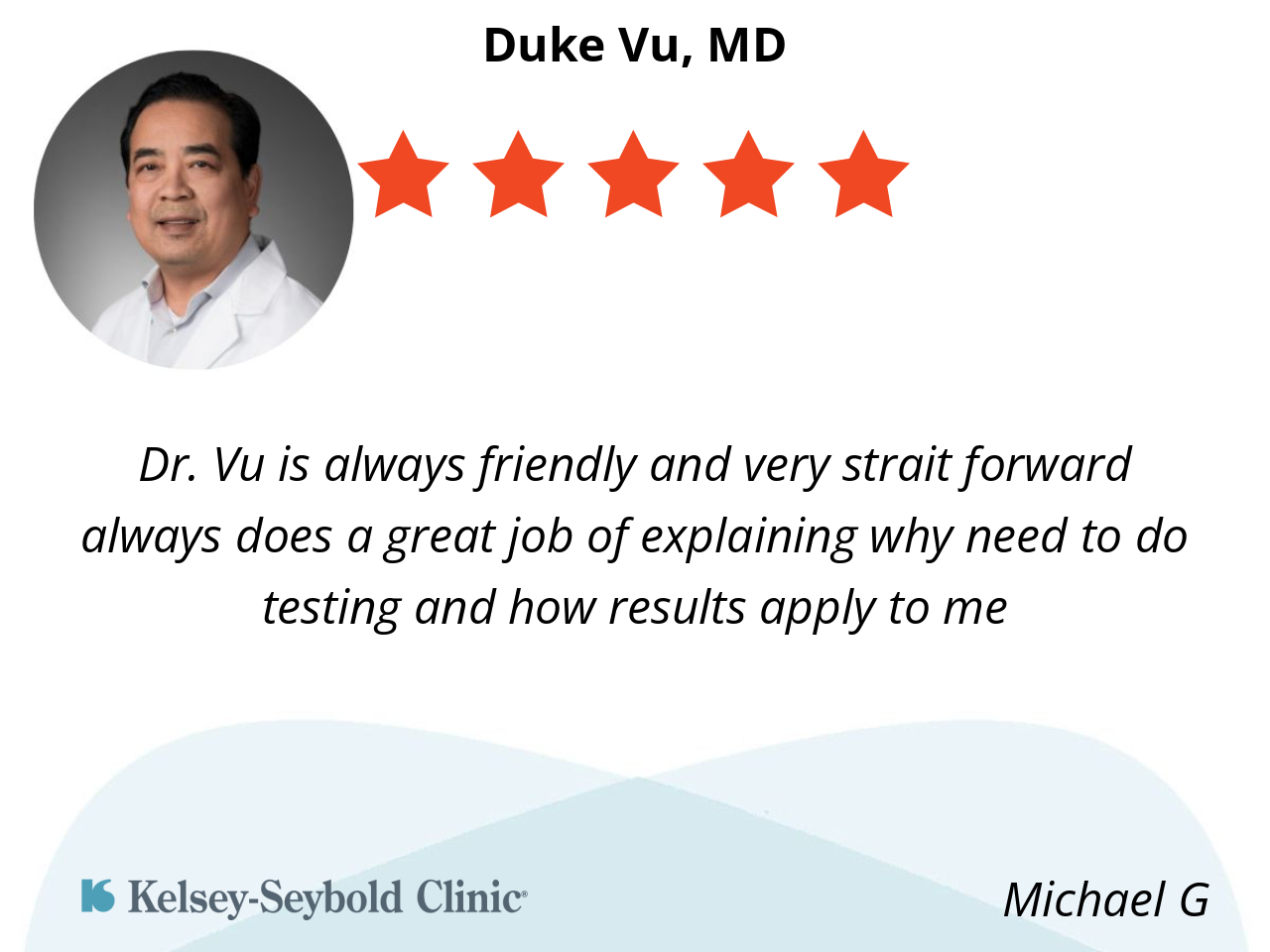 Dr. Vu is always friendly and very strait forward always does a great job of explaining why need to do testing and how results apply to me