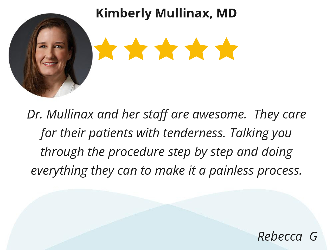 Dr. Mullinax and her staff are awesome. They care for their patients with tenderness. Talking you through the procedure step by step and doing everything they can to make it a painless process.