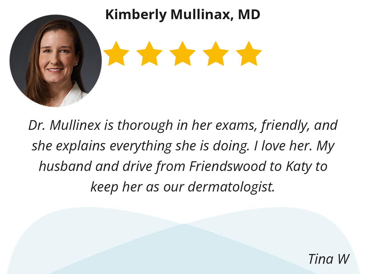 Dr. Mullinex is thorough in her exams, friendly, and she explains everything she is doing. I love her. My husband and drive from Friendswood to Katy to keep her as our dermatologist.