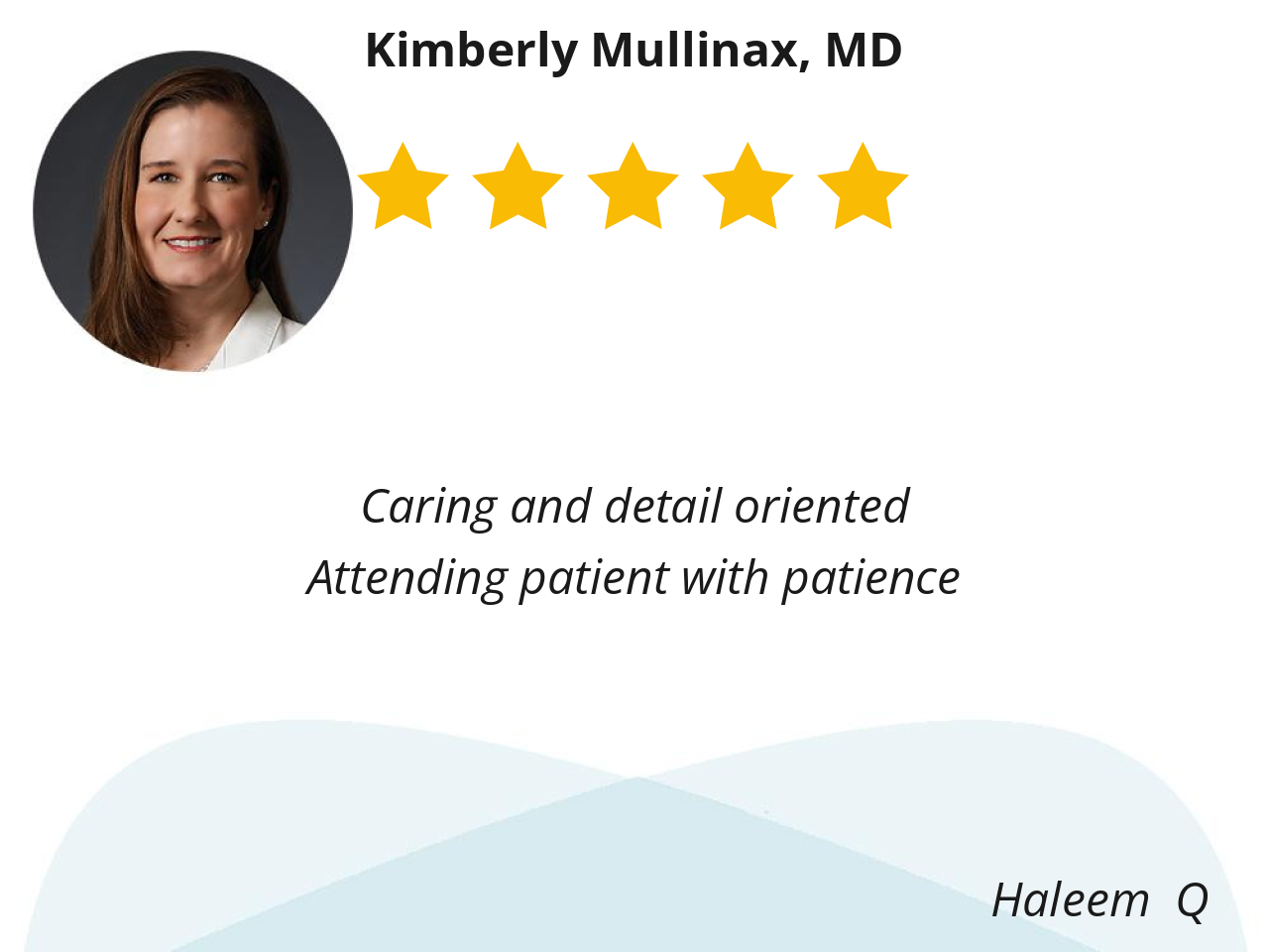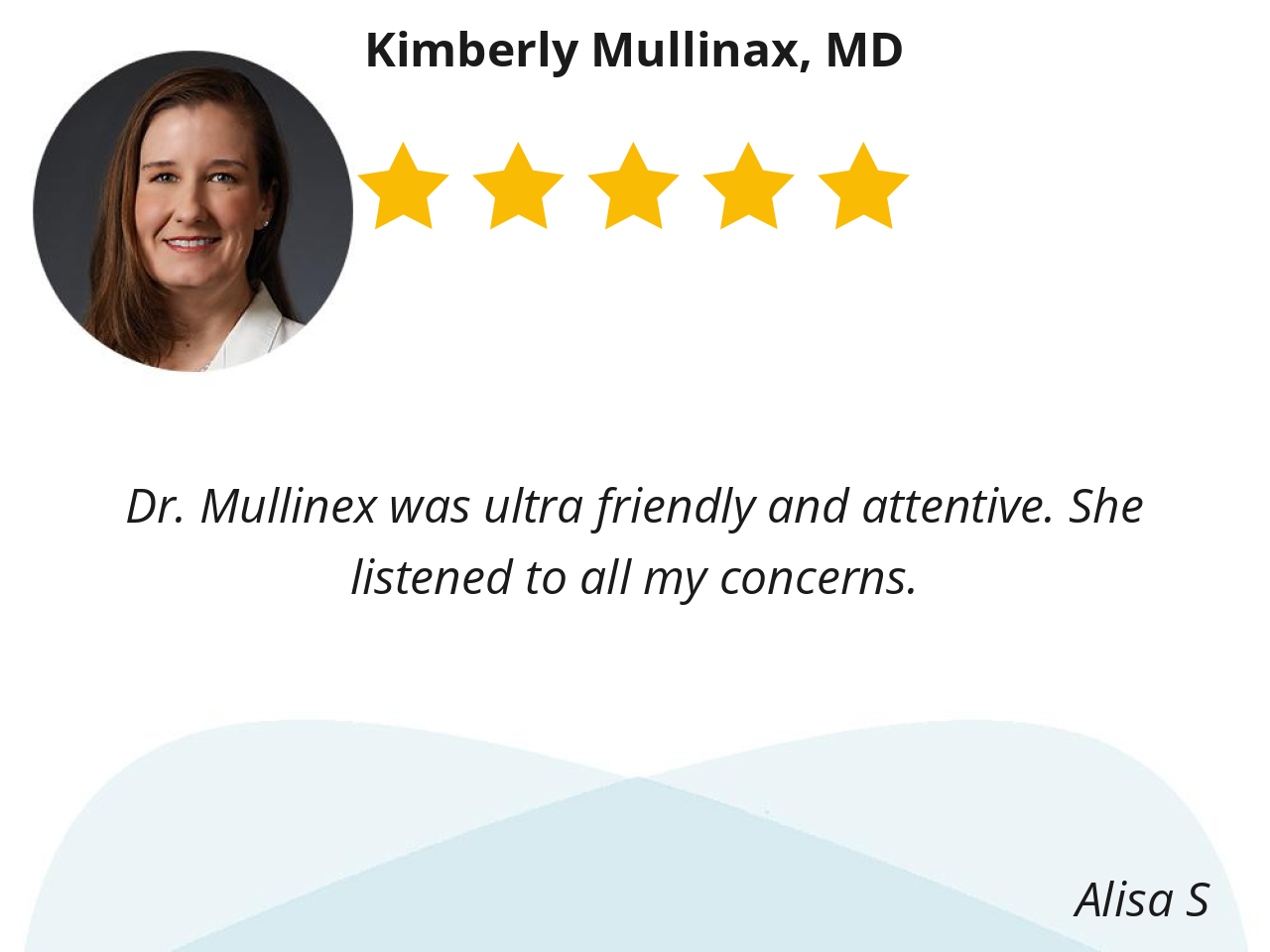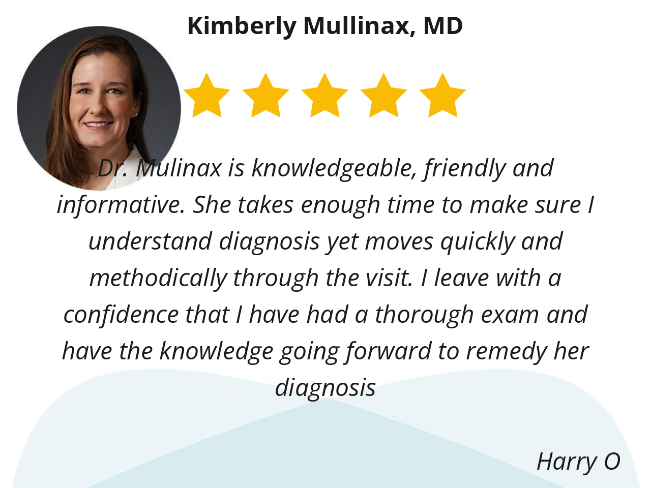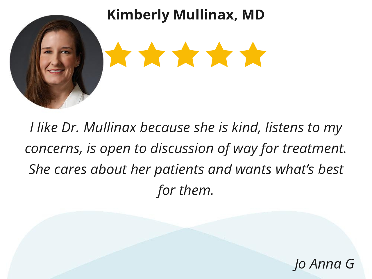 I like Dr. Mullinax because she is kind, listens to my concerns, is open to discussion of way for treatment. She cares about her patients and wants what’s best for them.