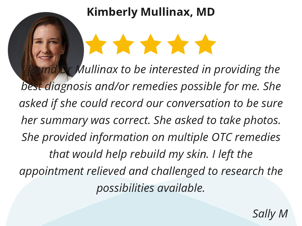 I found Dr Mullinax to be interested in providing the best diagnosis and/or remedies possible for me. She asked if she could record our conversation to be sure her summary was correct. She asked to take photos. She provided information on multiple OTC remedies that would help rebuild my skin. I left the appointment relieved and challenged to research the possibilities available.