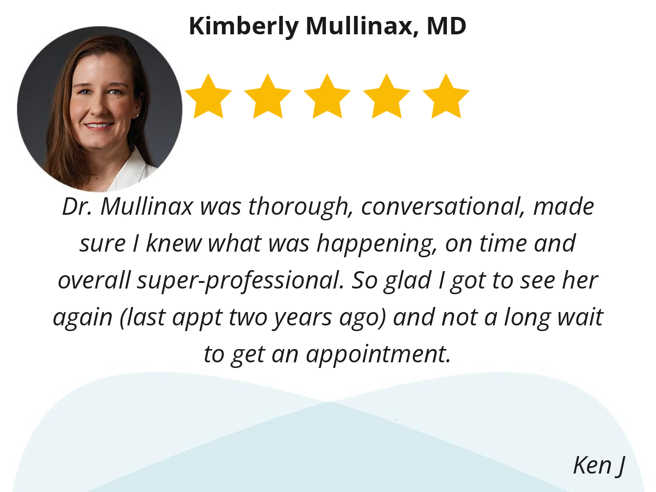 Dr. Mullinax was thorough, conversational, made sure I knew what was happening, on time and overall super-professional. So glad I got to see her again (last appt two years ago) and not a long wait to get an appointment.