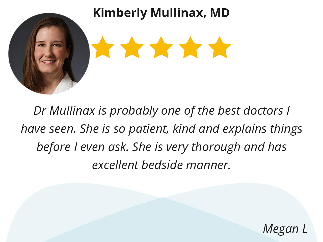 Dr Mullinax is probably one of the best doctors I have seen. She is so patient, kind and explains things before I even ask. She is very thorough and has excellent bedside manner.