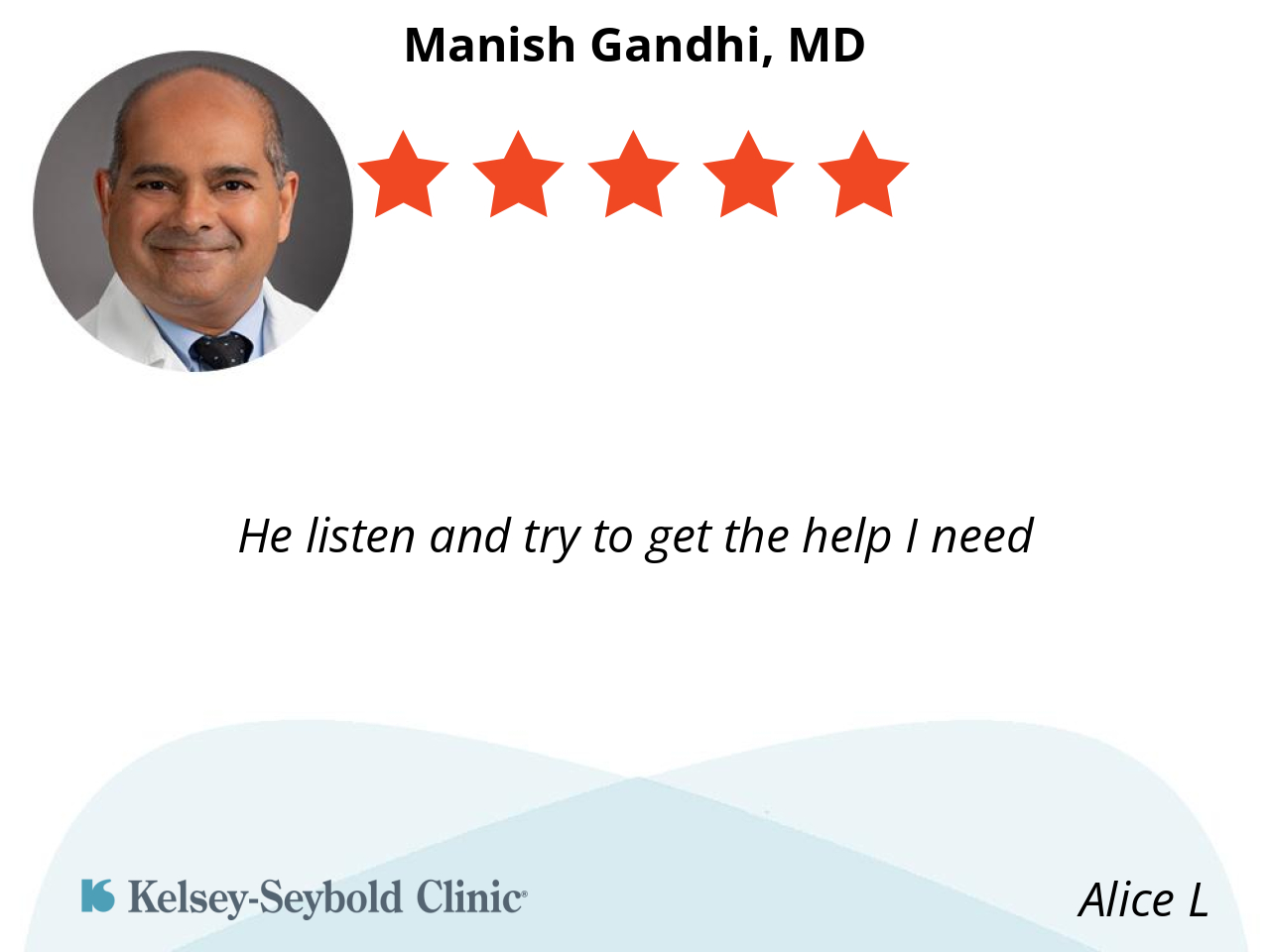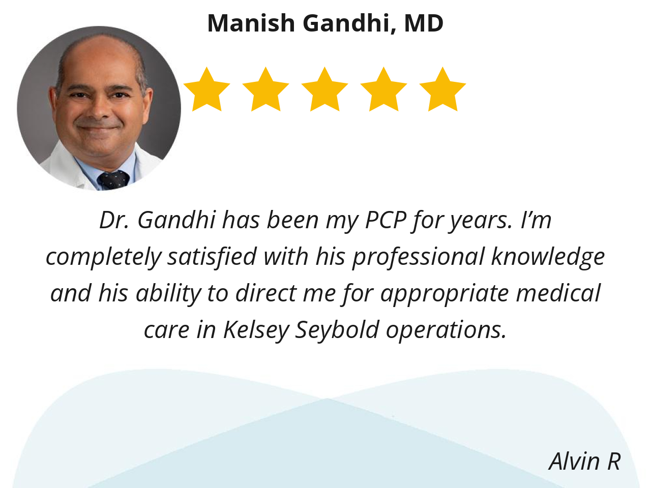 Dr. Gandhi has been my PCP for years. I’m completely satisfied with his professional knowledge and his ability to direct me for appropriate medical care in Kelsey Seybold operations.