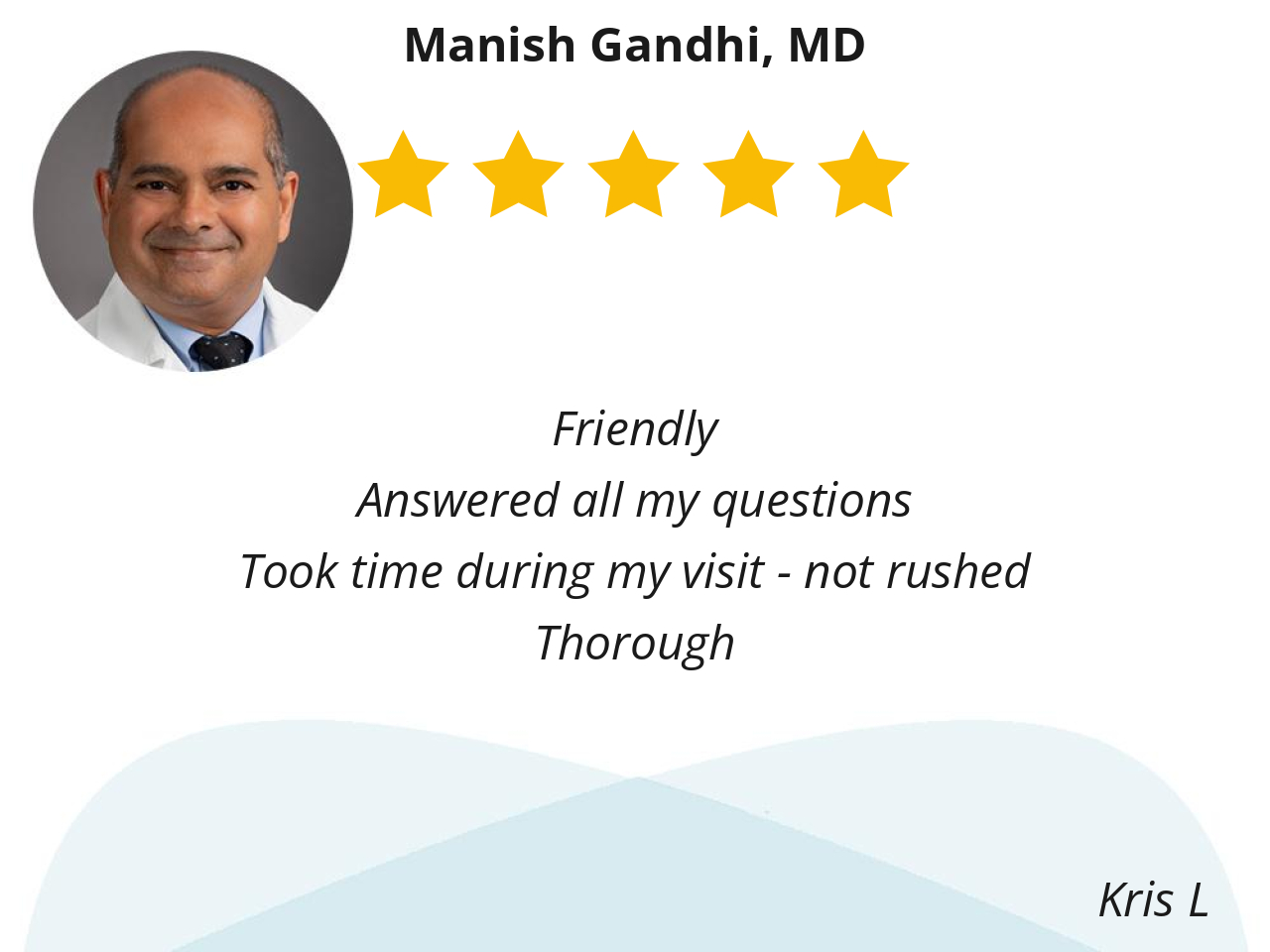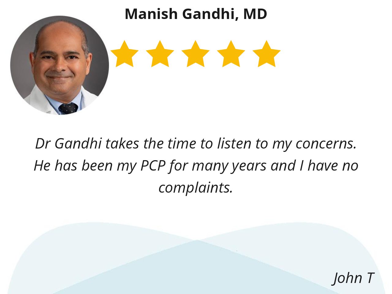 Dr Gandhi takes the time to listen to my concerns. He has been my PCP for many years and I have no complaints.