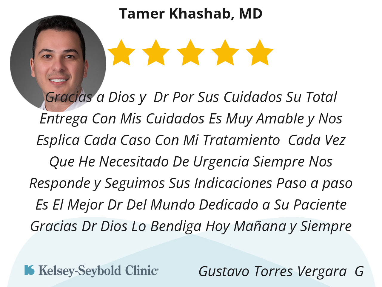 The concern he showed for him being late. Required why I was at the Main location instead of the Fort Bend location, where I live 20 minutes away. Throughly explained the reason for my high test results. Assured me that it was not real serious. I highly recommend Dr Khashab for a hematologist.