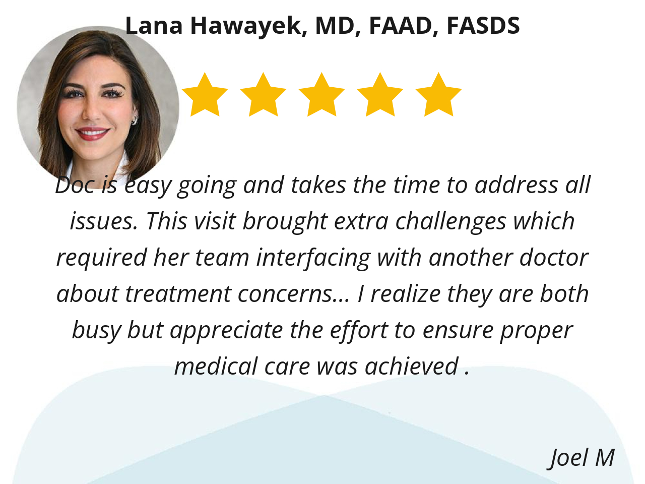 FIRST CLASS CARE BY DR HAWAYEK; HIGHLY COMPETENT DOCTOR AND NURSES; VERY RESPONSIVE TO QUESTIONS AND REQUESTS FOR ASSISTANCE!!!!!