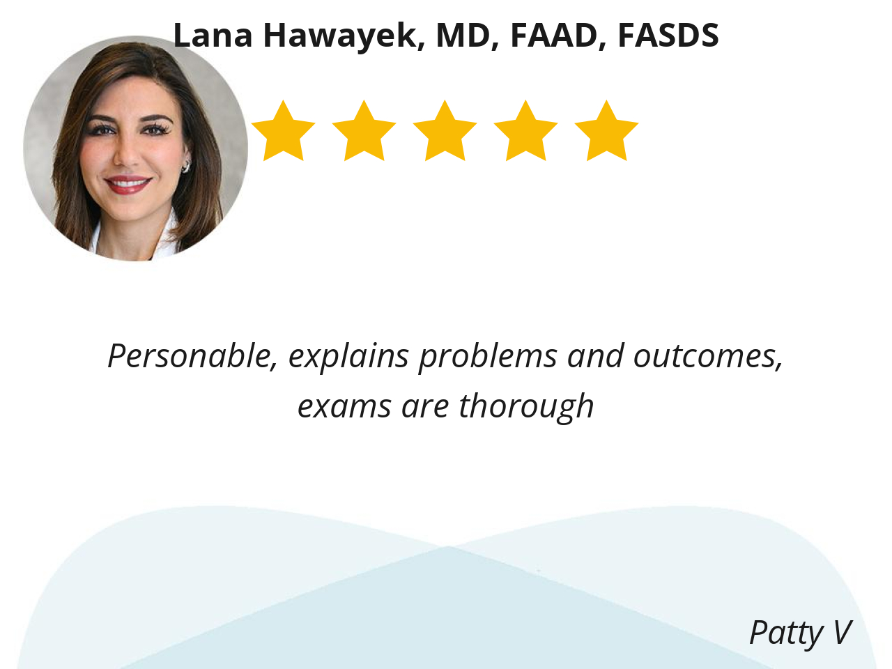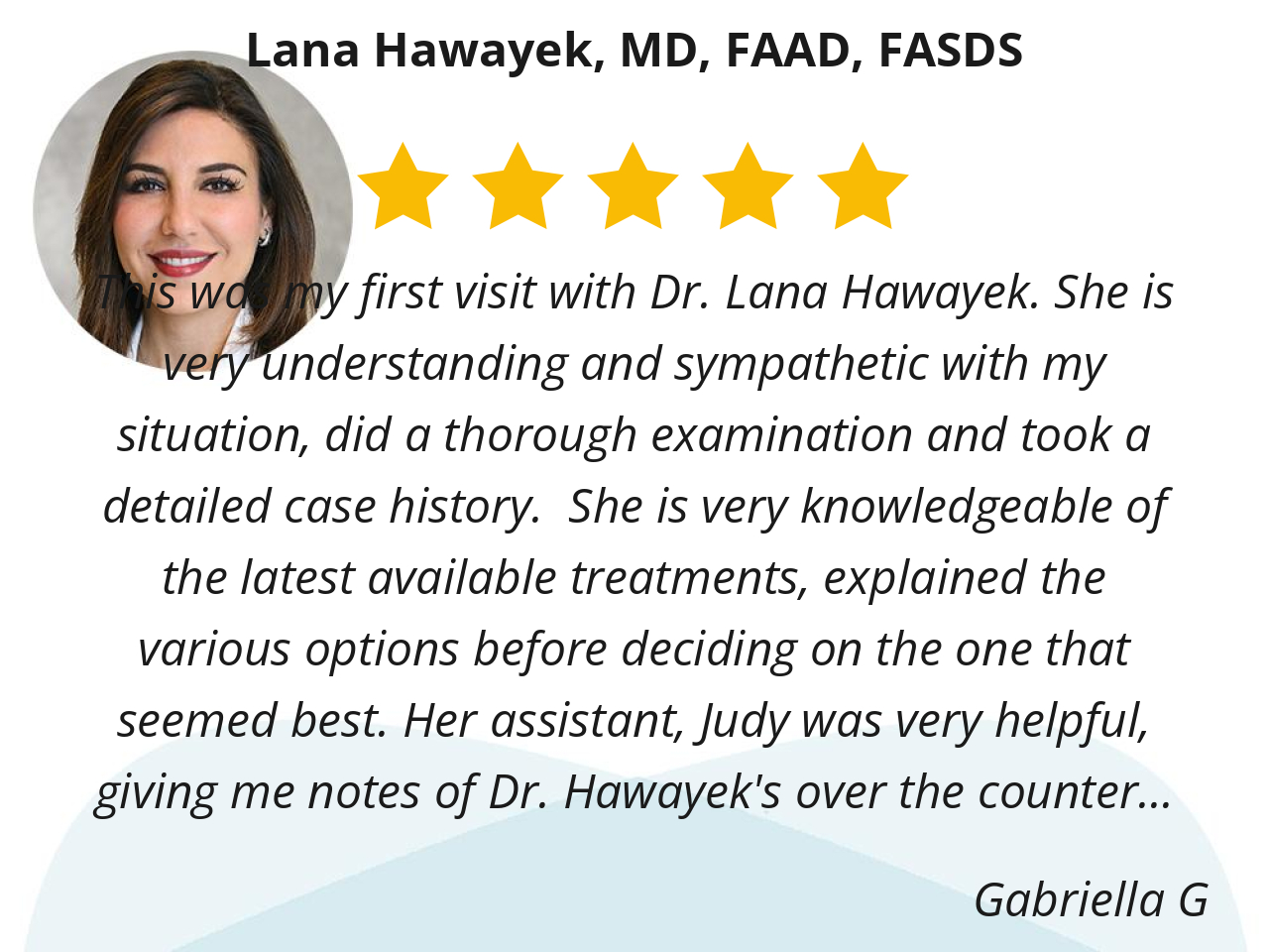 This was my first visit with Dr. Lana Hawayek. She is very understanding and sympathetic with my situation, did a thorough examination and took a detailed case history. She is very knowledgeable of the latest available treatments, explained the various options before deciding on the one that seemed best. Her assistant, Judy was very helpful, giving me notes of Dr. Hawayek's over the counter suggestions. I highly recommend Dr. Hawayek's services.