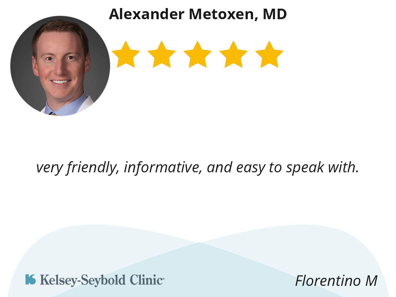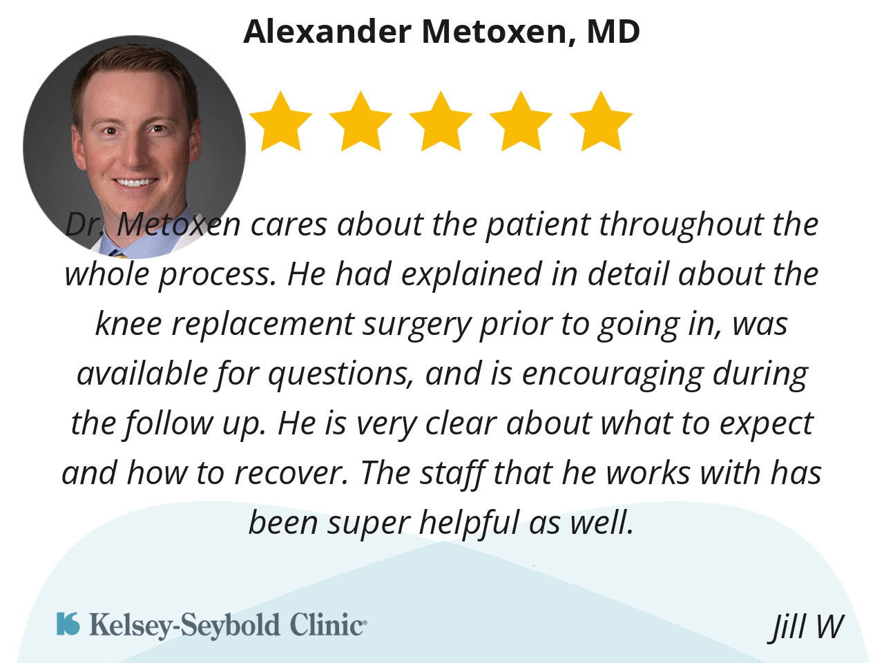 Dr. Metoxen cares about the patient throughout the whole process. He had explained in detail about the knee replacement surgery prior to going in, was available for questions, and is encouraging during the follow up. He is very clear about what to expect and how to recover. The staff that he works with has been super helpful as well.
