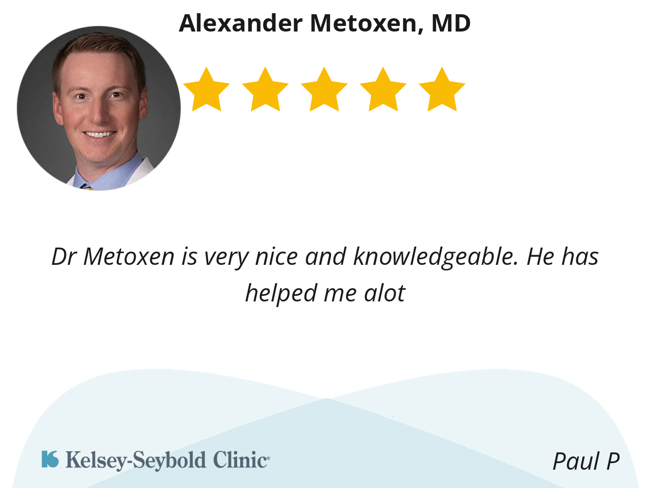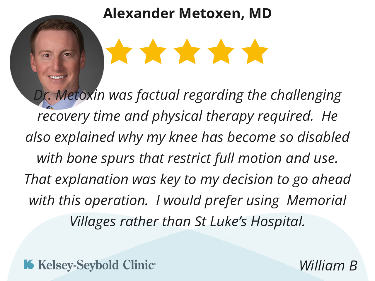 Dr. Metoxin was factual regarding the challenging recovery time and physical therapy required. He also explained why my knee has become so disabled with bone spurs that restrict full motion and use. That explanation was key to my decision to go ahead with this operation. I would prefer using Memorial Villages rather than St Luke’s Hospital.