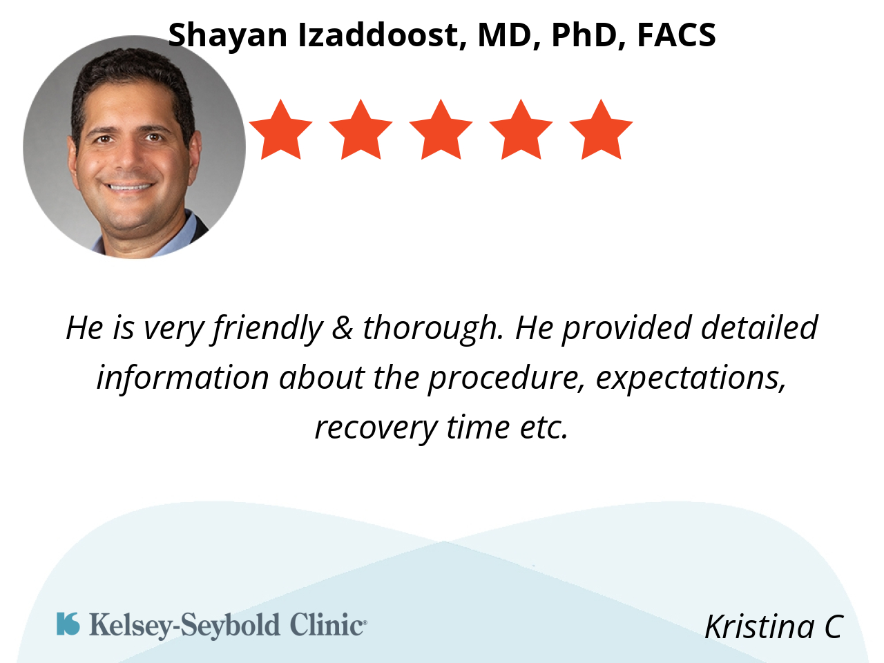 I have known Dr. Izaddoost for the past 6 years while I have gone through my breast cancer journey. He has always been kind and given his time and energies to give me his best! He has and continues to listen attentively to my concerns. He is simply the best!