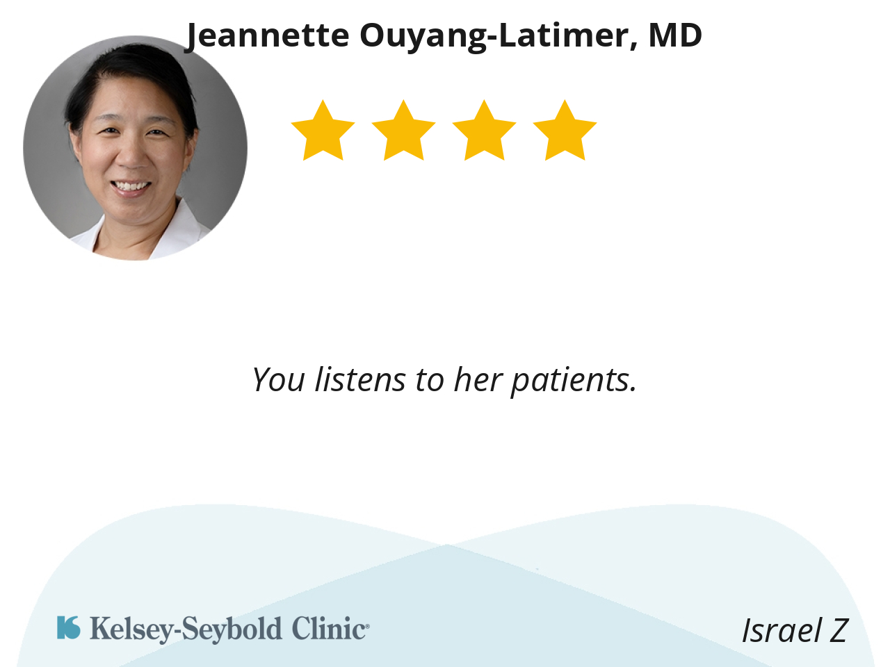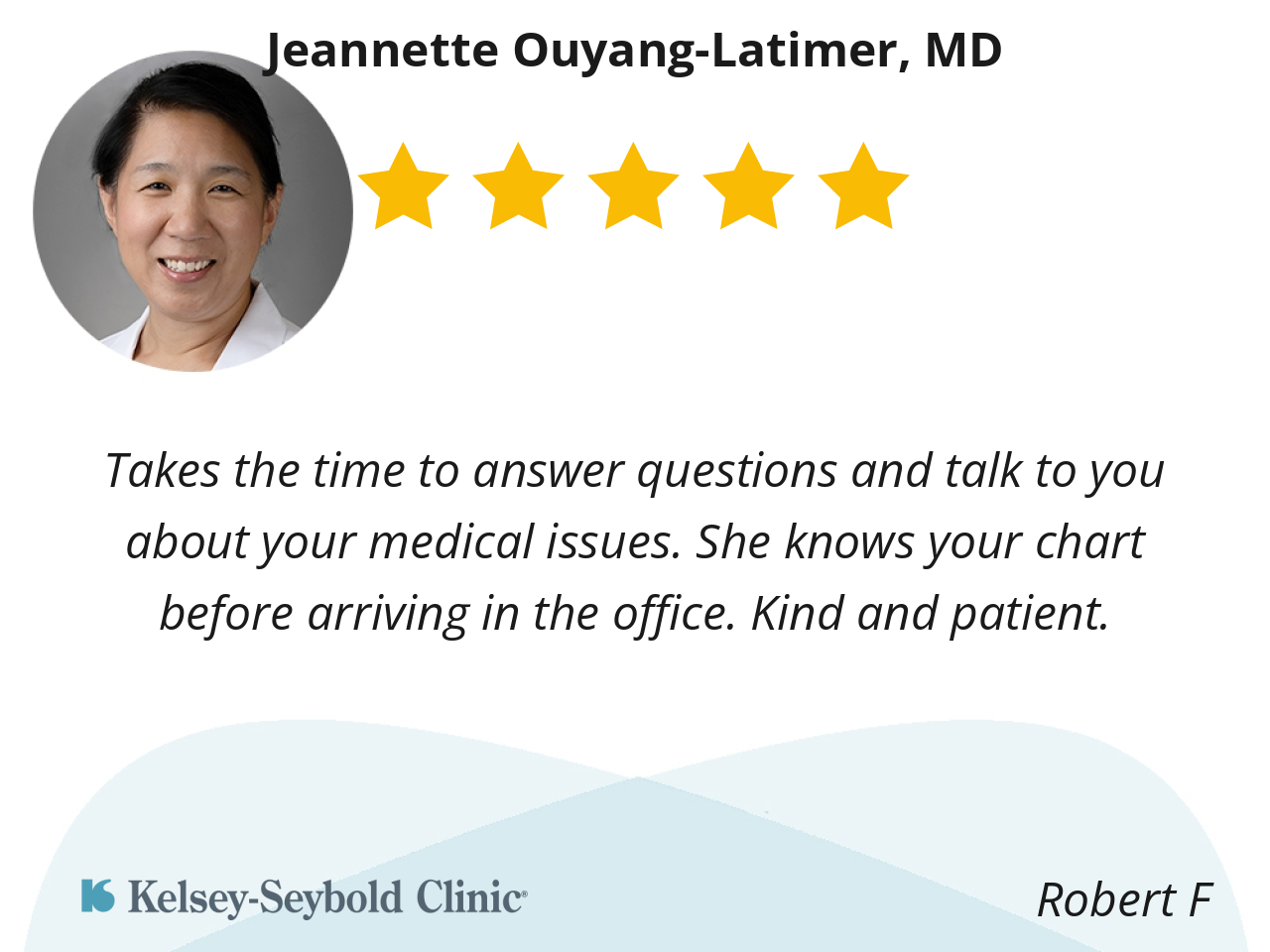 I like Dr. Ouyang Latimer because she is very patient with me, always put smile in my face whenever it’s time for me visit. She is very encouraging making sure I do the right thing, she has being my Doctor since 2018 I can’t trade her for another Doctor, she make me to go through this journey nothing feeling like am all alone.