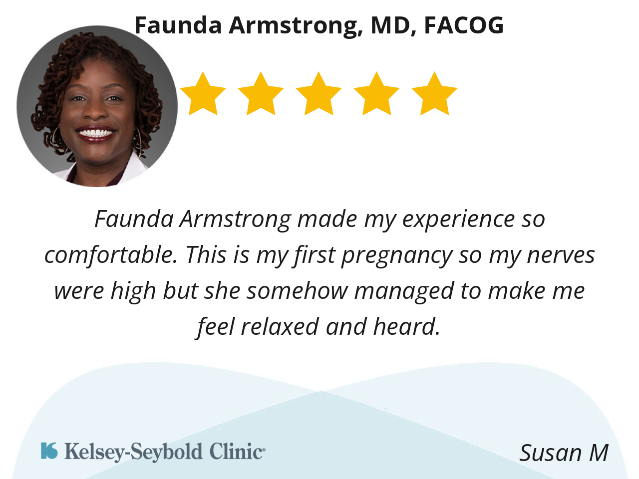 Dr. F. Armstrong is the best doctor. She is very thorough and knowledgeable. This is my first baby and she has made my experience and pregnancy so easy. Thank you Dr. Armstrong for being there every step of the way.