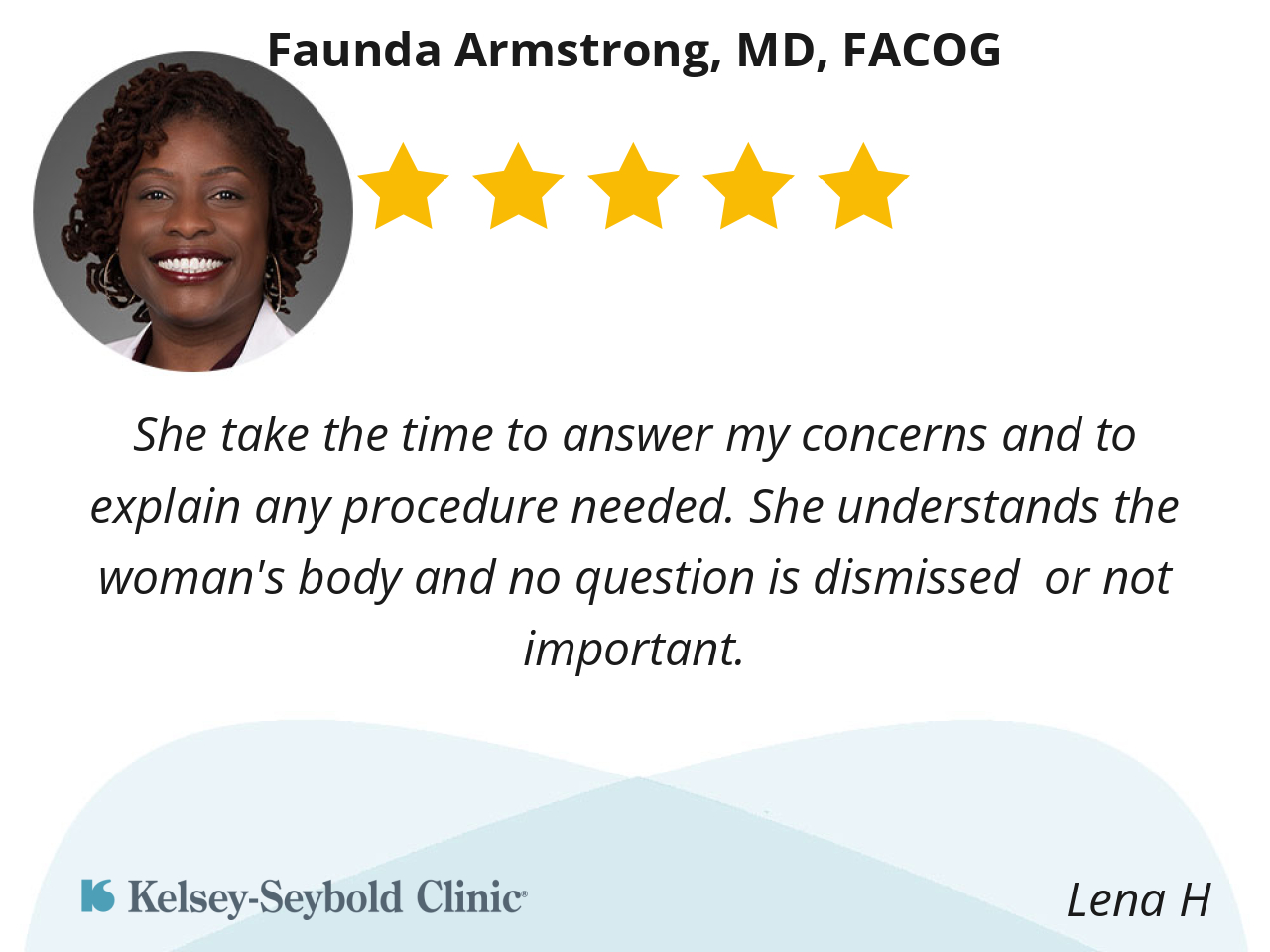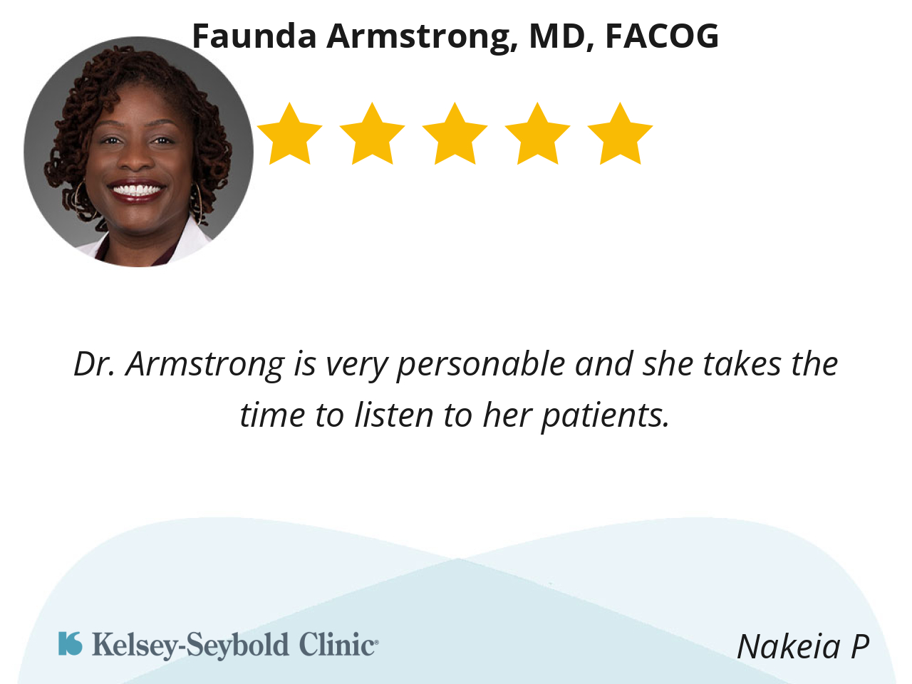 Dr.Armstrong is truly amazing! I love her positivity and her kindness. My husband and I appreciate her willingness to serve us with excellence. I would highly recommend her as your OBGYN.