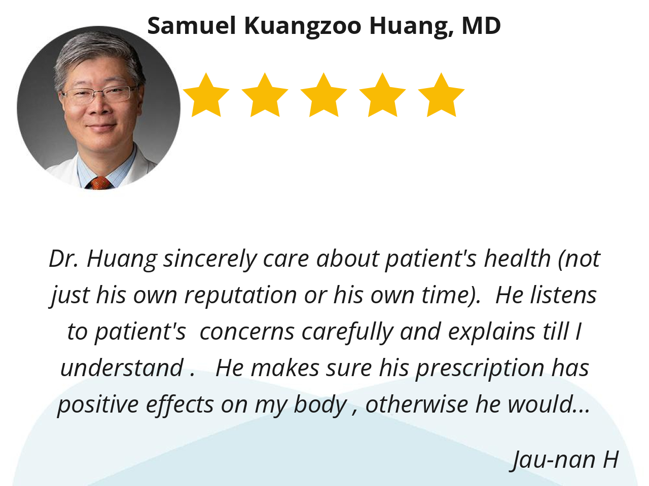 Dr. Huang sincerely care about patient's health (not just his own reputation or his own time). He listens to patient's concerns carefully and explains till I understand . He makes sure his prescription has positive effects on my body , otherwise he would change the medication to make it better for my body.