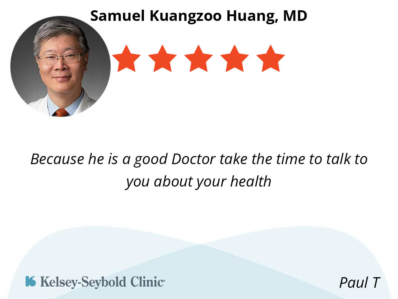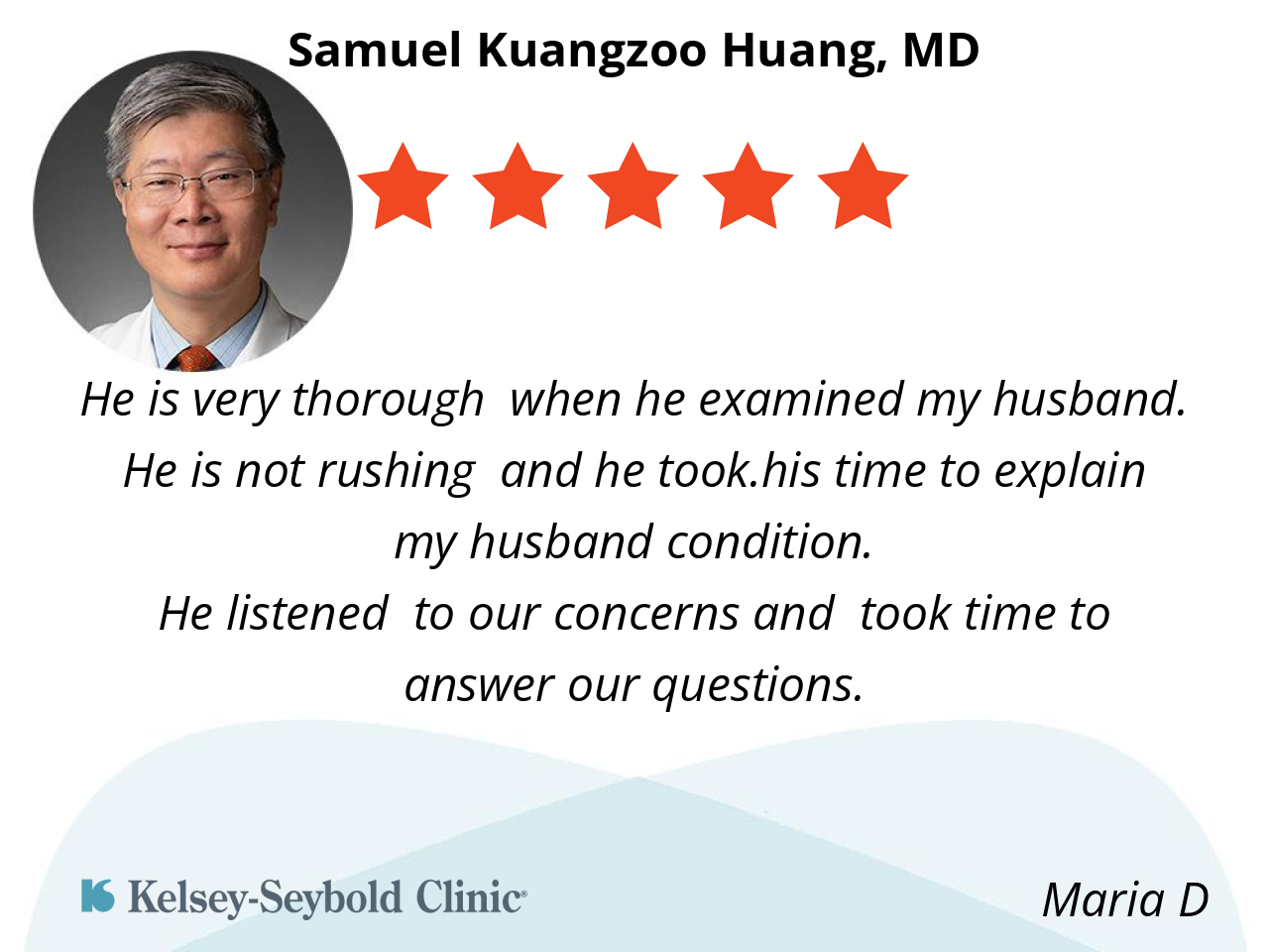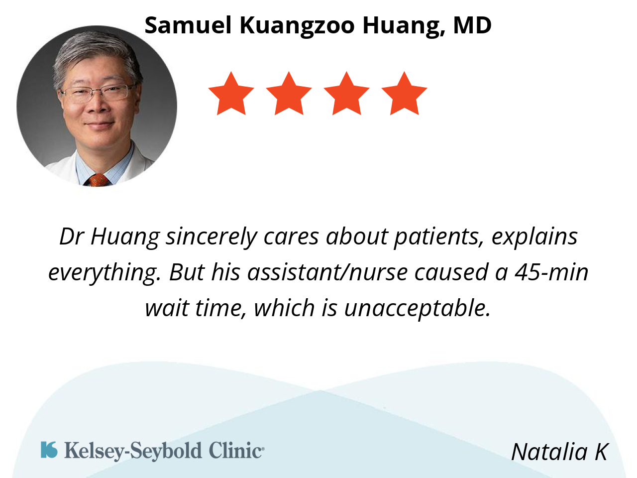 Dr. Huang is a dedicated, knowledgeable, and caring physician who communicates complex medical information clearly. He listens attentively, explains thoroughly, and consistently demonstrates professionalism and an excellent bedside manner. Highly recommended.
