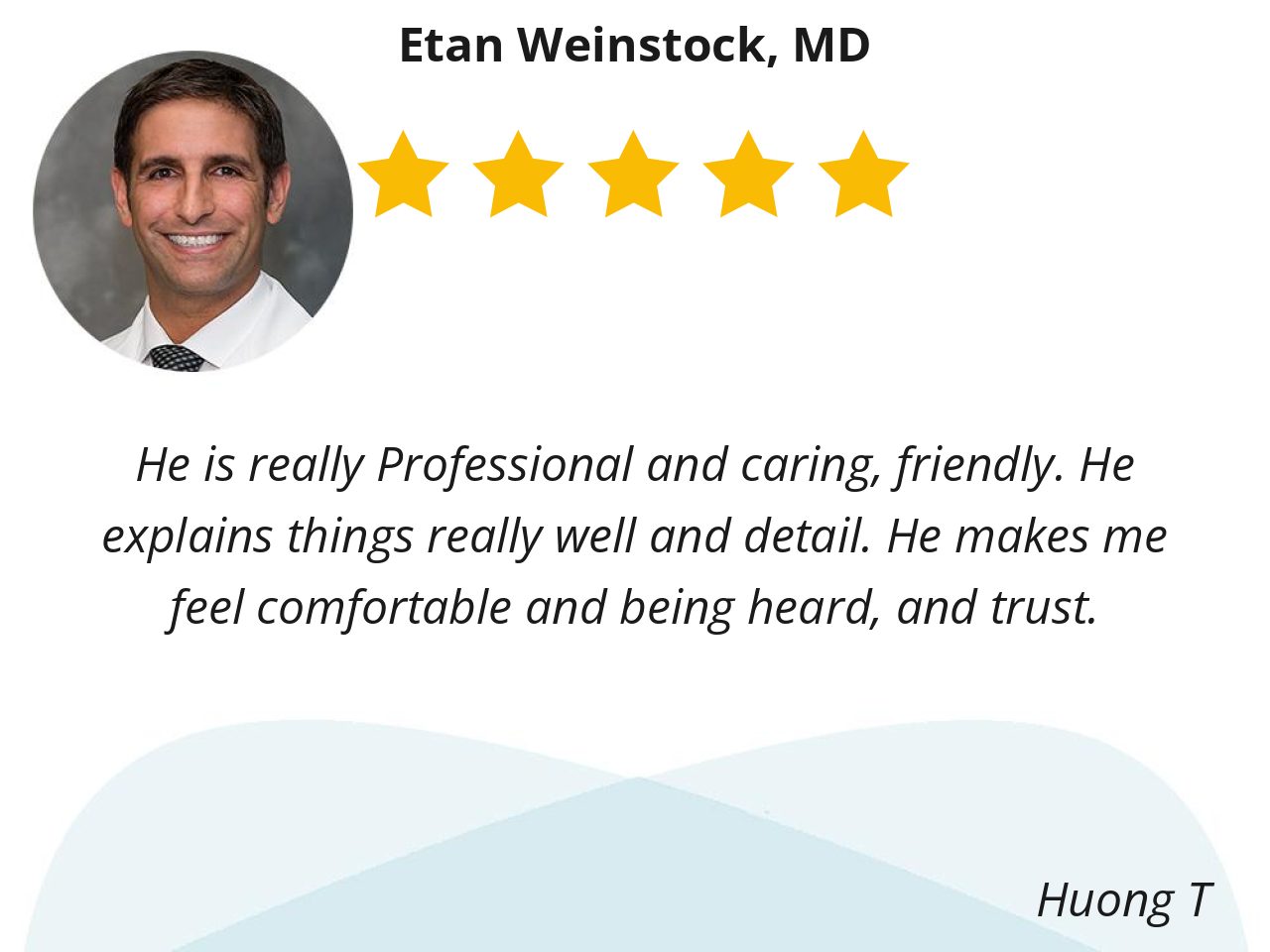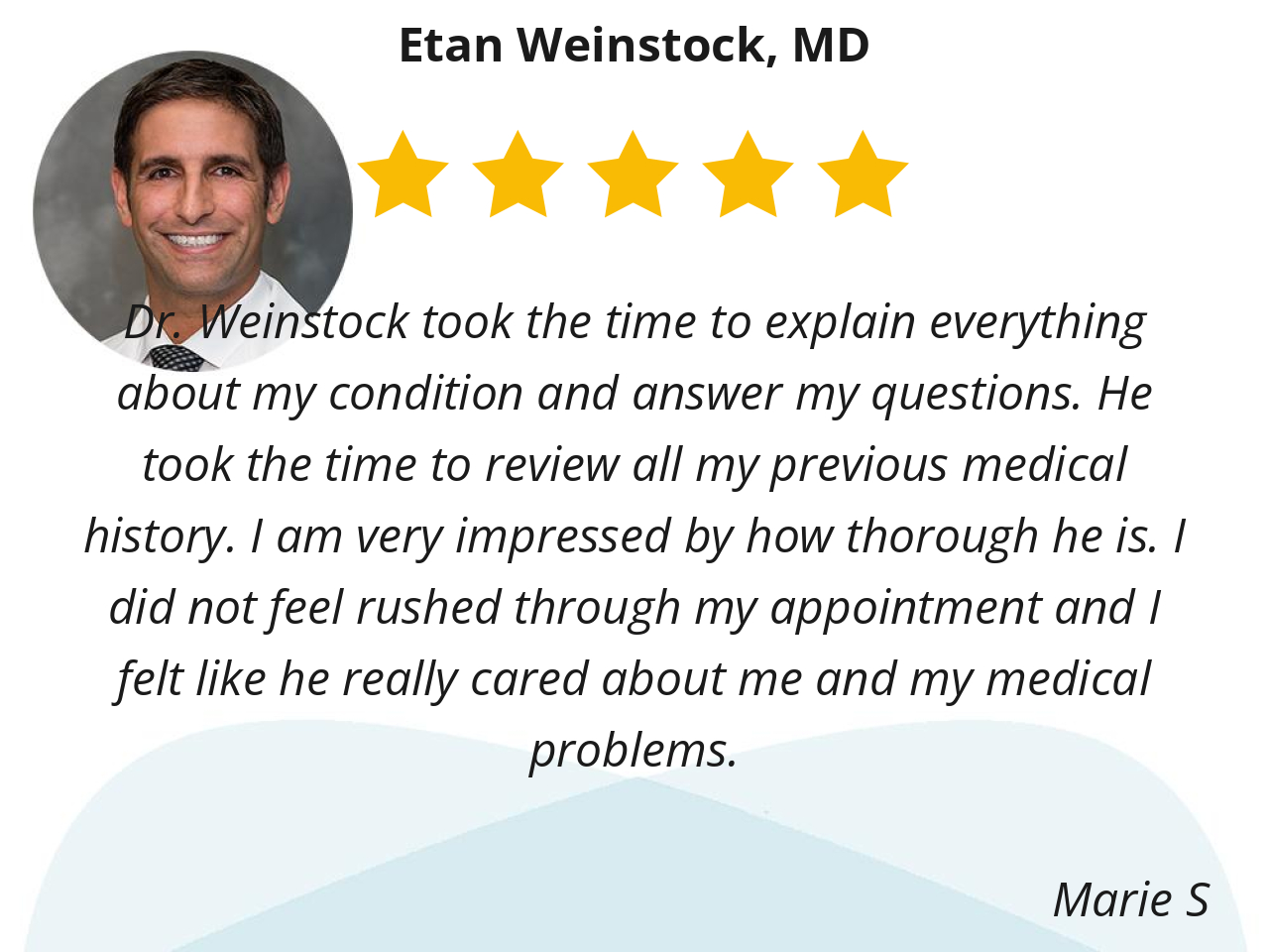 Dr. Weinstock took the time to explain everything about my condition and answer my questions. He took the time to review all my previous medical history. I am very impressed by how thorough he is. I did not feel rushed through my appointment and I felt like he really cared about me and my medical problems.
